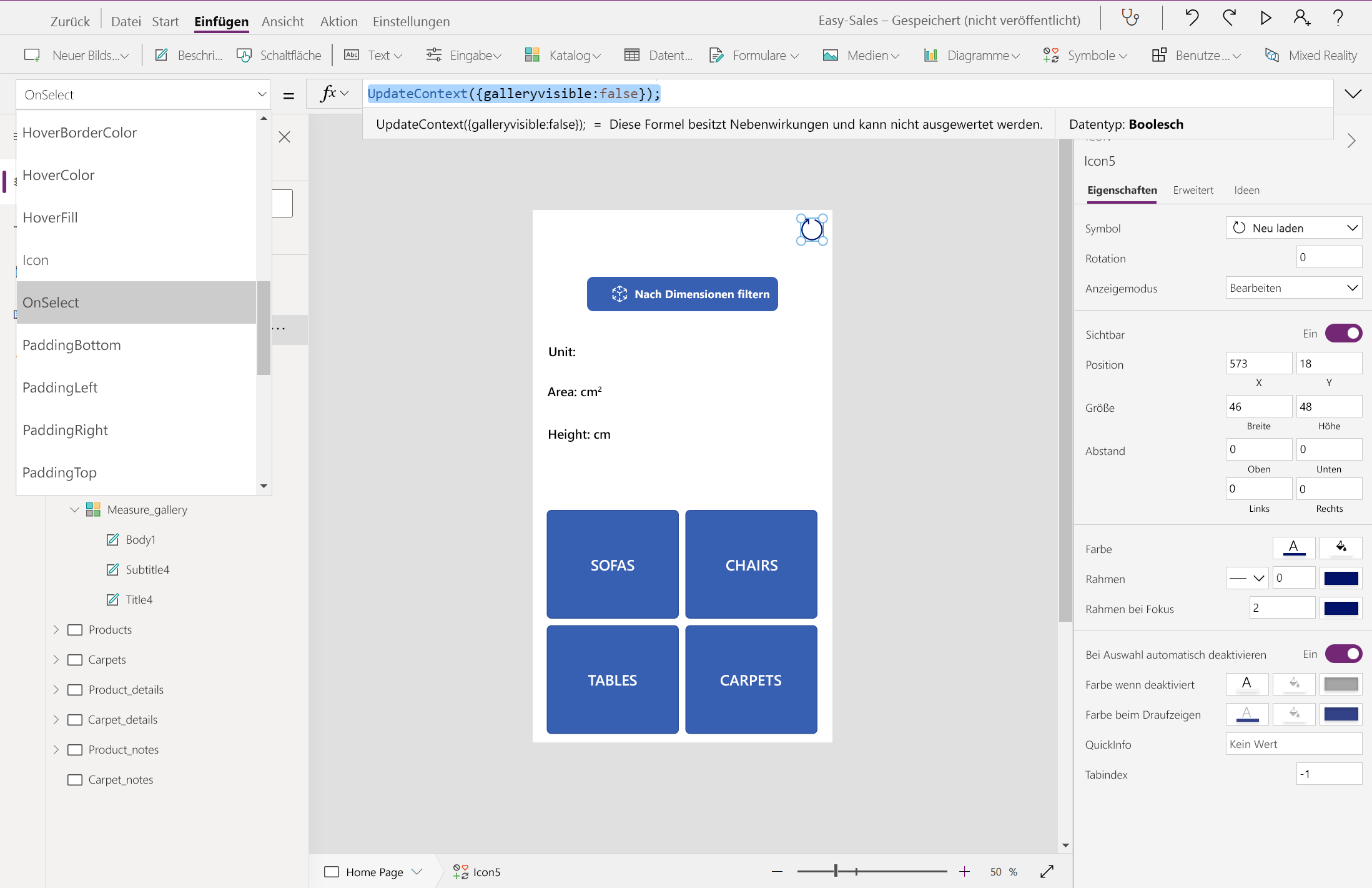 Positionieren Sie das Symbol wie im Bild dargestellt, und konfigurieren Sie die OnSelect-Eigenschaft wie folgt: