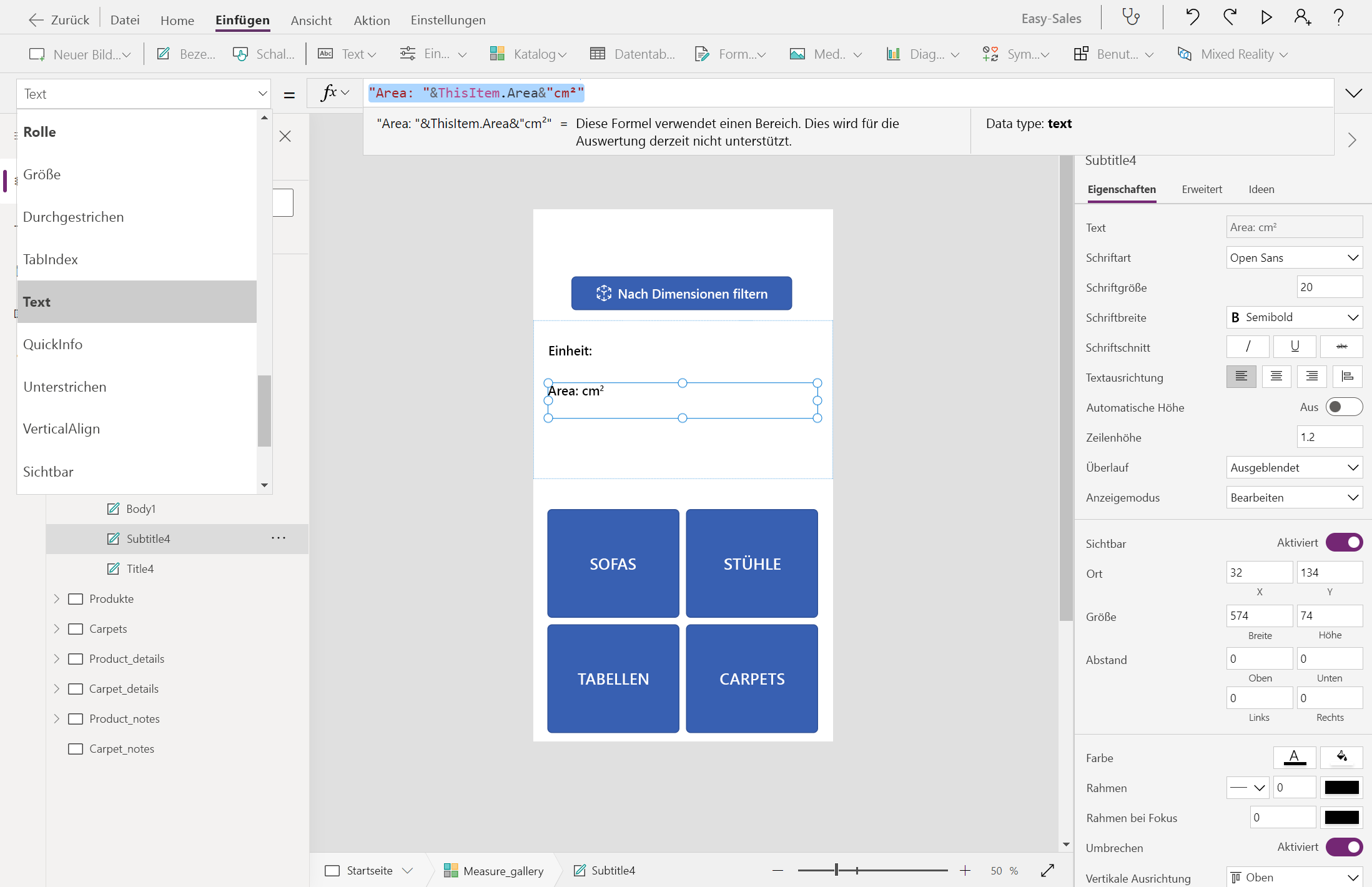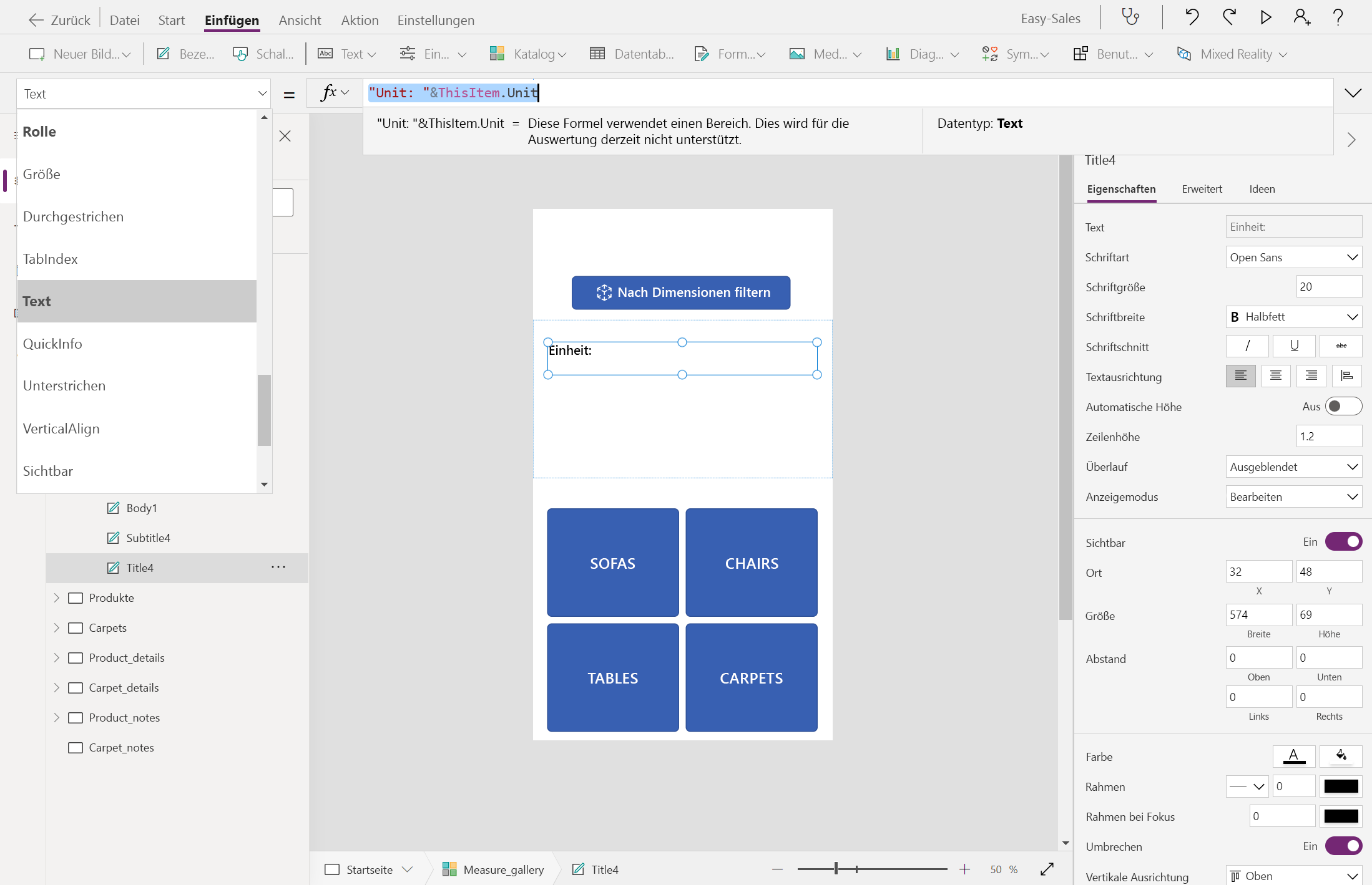 If( ID = 1 And Measure_gallery.Selected.Height = 0, (Filter('Easy Sales',(ProductCategory = "Sofa") And ((Depth < Measure_gallery.Selected.BoundingDepth And Width < Measure_gallery.Selected.BoundingWidth) Or (Depth < Measure_gallery.Selected.BoundingWidth And Width < Measure_gallery.Selected.BoundingDepth)))), ID = 1 And Measure_gallery.Selected.Height > 0, (Filter('Easy Sales',(ProductCategory = "Sofa") And ((Depth < Measure_gallery.Selected.BoundingDepth And Width < Measure_gallery.Selected.BoundingWidth And Height <= Measure_gallery.Selected.Height) Or (Depth < Measure_gallery.Selected.BoundingWidth And Width < Measure_gallery.Selected.BoundingDepth And Height <= Measure_gallery.Selected.Height)))), ID = 1, Filter('Easy Sales',ProductCategory = "Sofa"), ID = 2, Filter('Easy Sales',ProductCategory = "Chair"), ID = 2 And Measure_gallery.Selected.Height = 0, (Filter('Easy Sales',(ProductCategory = "Chair") And ((Depth < Measure_gallery.Selected.BoundingDepth And Width < Measure_gallery.Selected.BoundingWidth) Or (Depth < Measure_gallery.Selected.BoundingWidth And Width < Measure_gallery.Selected.BoundingDepth)))), ID = 2 And Measure_gallery.Selected.Height > 0, (Filter('Easy Sales',(ProductCategory = "Chair") And ((Depth < Measure_gallery.Selected.BoundingDepth And Width < Measure_gallery.Selected.BoundingWidth And Height <= Measure_gallery.Selected.Height) Or (Depth < Measure_gallery.Selected.BoundingWidth And Width < Measure_gallery.Selected.BoundingDepth And Height <= Measure_gallery.Selected.Height)))), ID = 3, Filter('Easy Sales',ProductCategory = "Table"), ID = 3 And Measure_gallery.Selected.Height = 0, (Filter('Easy Sales',(ProductCategory = "Table") And ((Depth < Measure_gallery.Selected.BoundingDepth And Width < Measure_gallery.Selected.BoundingWidth) Or (Depth < Measure_gallery.Selected.BoundingWidth And Width < Measure_gallery.Selected.BoundingDepth)))), ID = 3 And Measure_gallery.Selected.Height > 0, (Filter('Easy Sales',(ProductCategory = "Table") And ((Depth < Measure_gallery.Selected.BoundingDepth And Width < Measure_gallery.Selected.BoundingWidth And Height <= Measure_gallery.Selected.Height) Or (Depth < Measure_gallery.Selected.BoundingWidth And Width < Measure_gallery.Selected.BoundingDepth And Height <= Measure_gallery.Selected.Height)))) )Von Bedeutung
