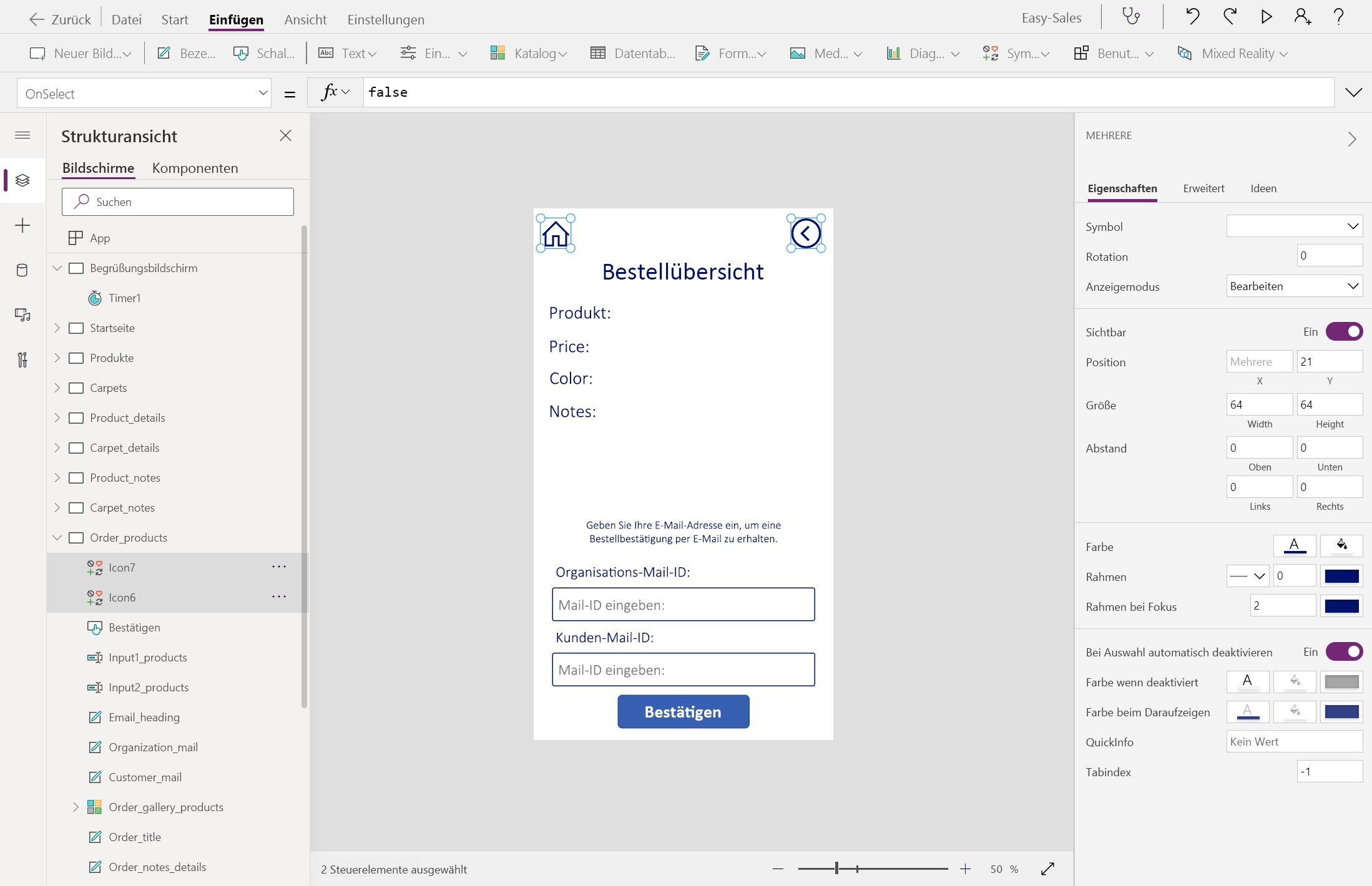 Wählen Sie den Product_details Bildschirm aus, und konfigurieren Sie dann die OnSelect-Eigenschaft der Schaltfläche " Bestellung " wie folgt: