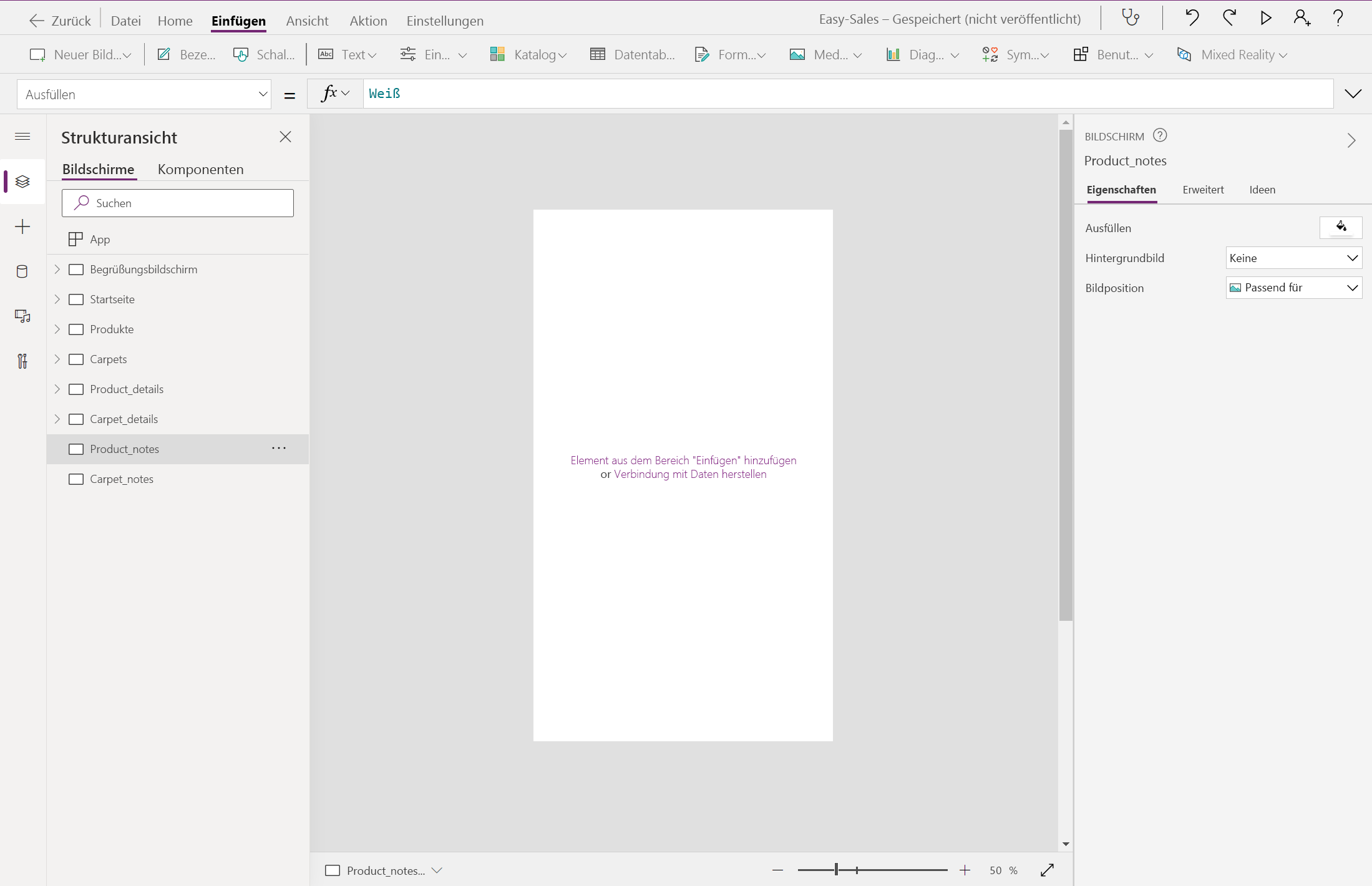 Erstellen Sie zwei neue leere Bildschirme, und benennen Sie sie Product_notes und Carpet_notes um.