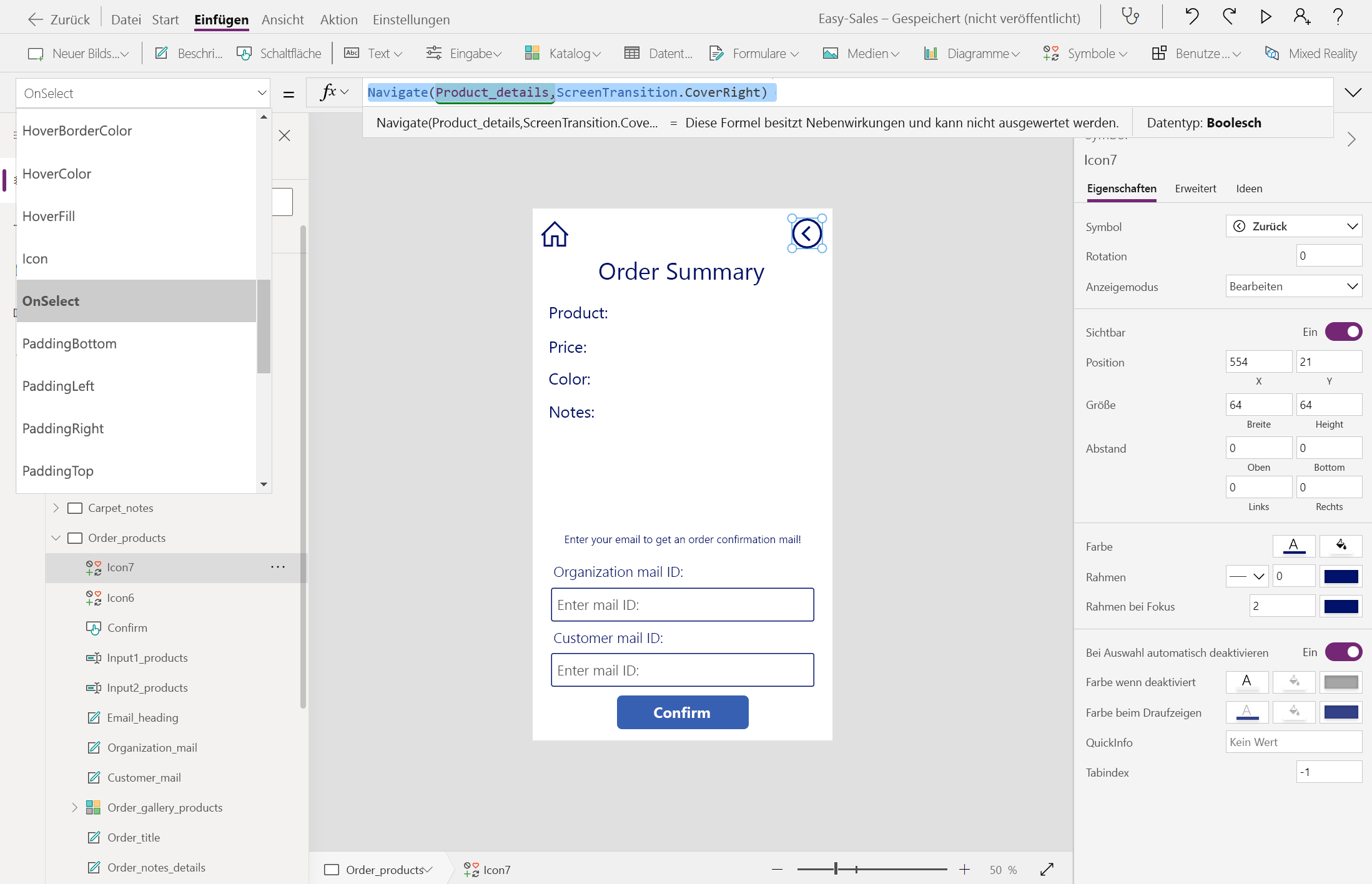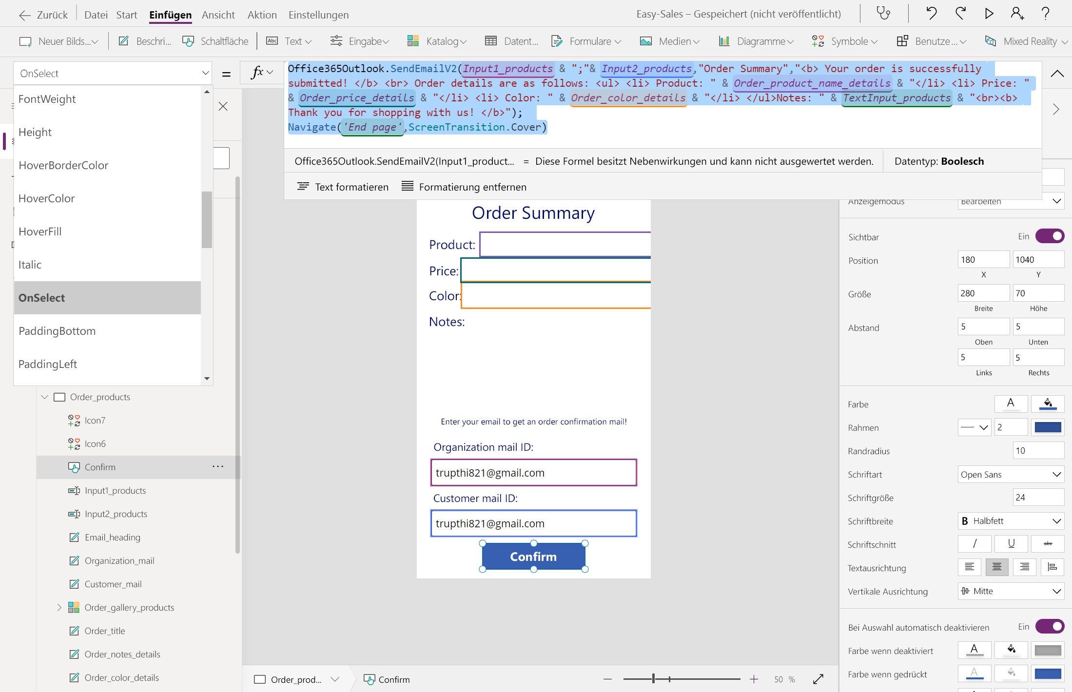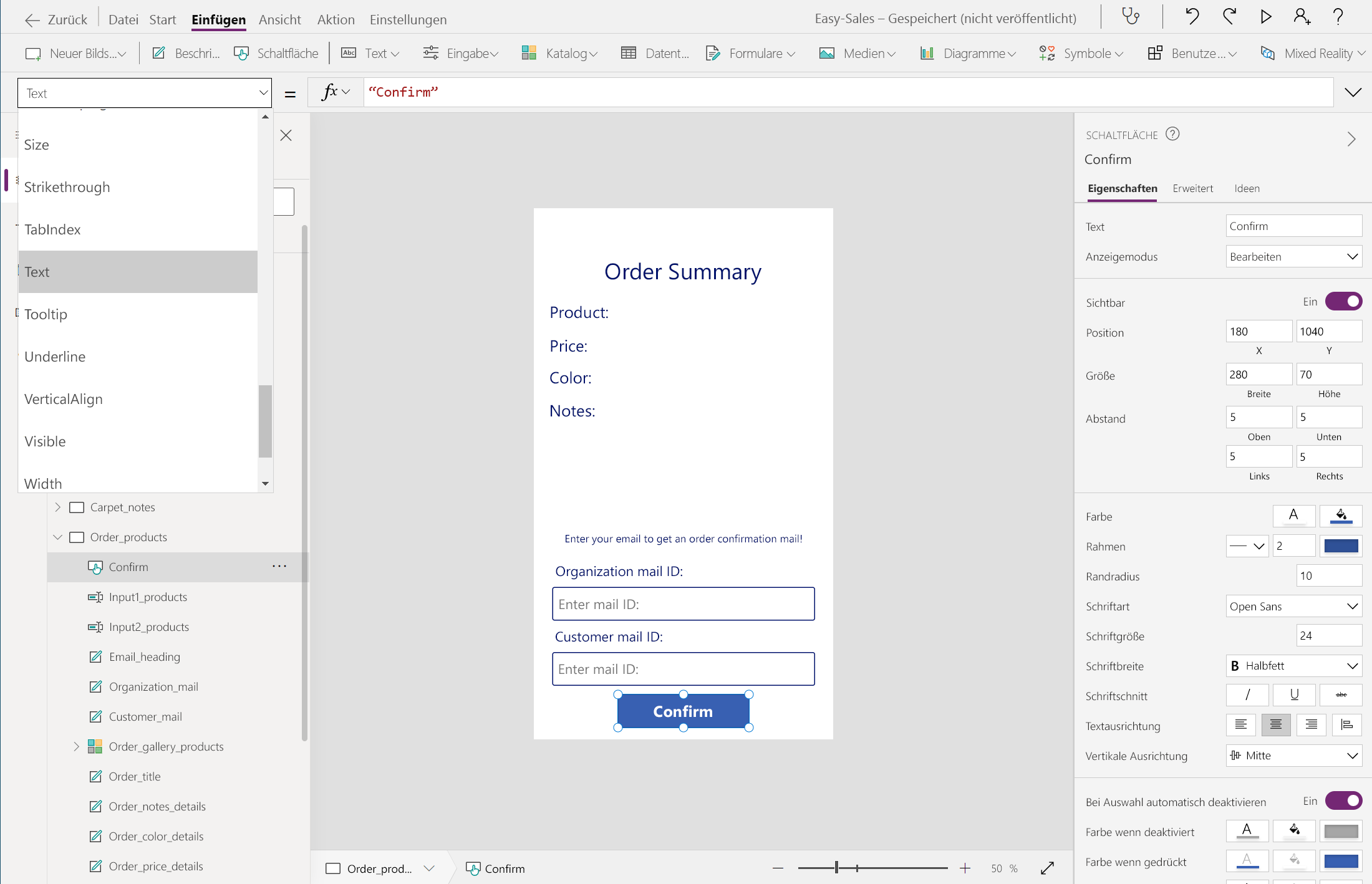 Öffnen Sie Order_products , und konfigurieren Sie dann die OnSelect-Eigenschaft der Schaltfläche " Bestätigen ", indem Sie die folgenden Zeilen hinzufügen:
