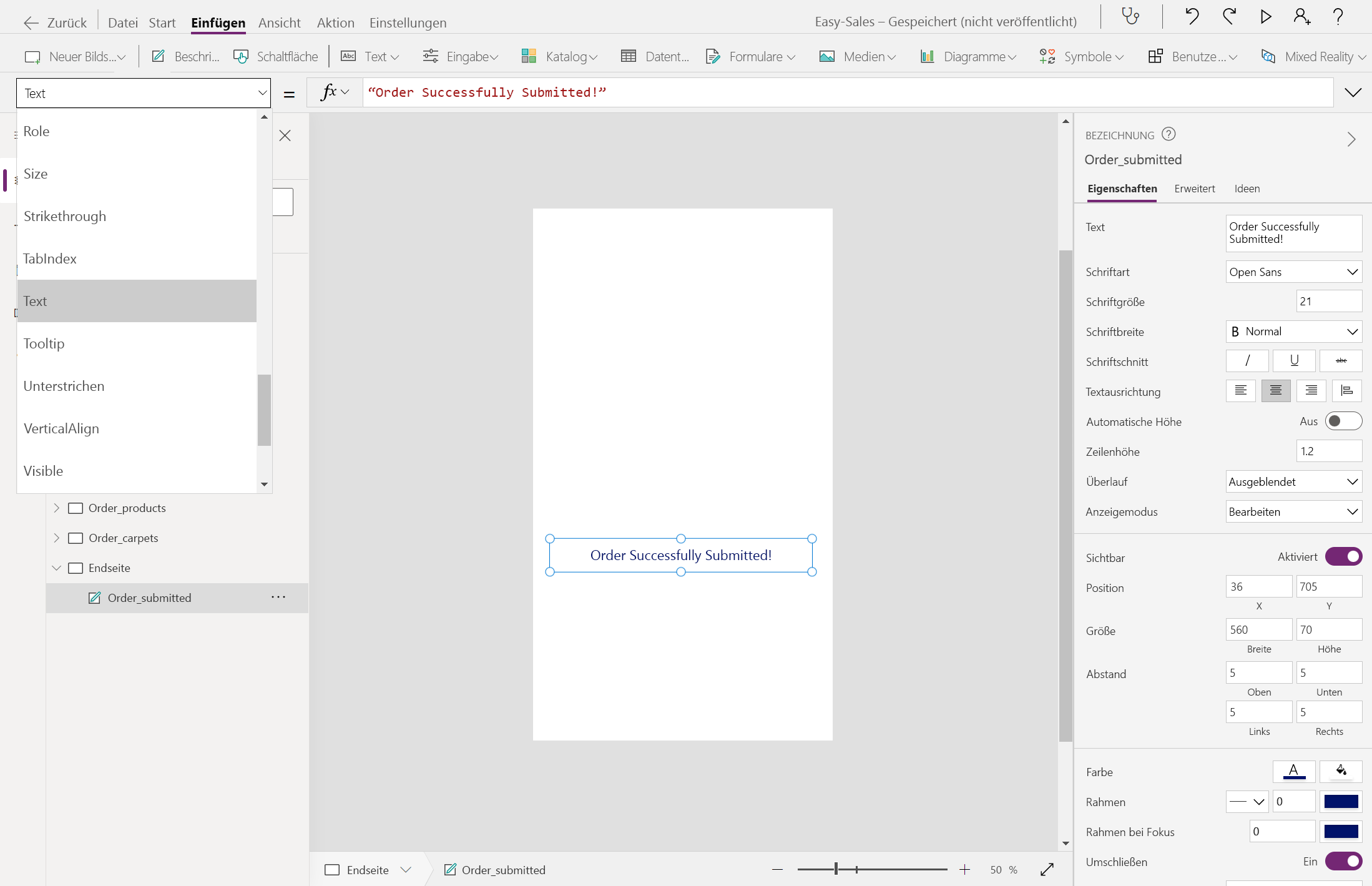Fügen Sie eine Beschriftung hinzu, und ändern Sie den Anzeigetext in "Bestellung erfolgreich übermittelt!". Positionieren Sie die Beschriftung nach Bedarf auf dem Bildschirm.