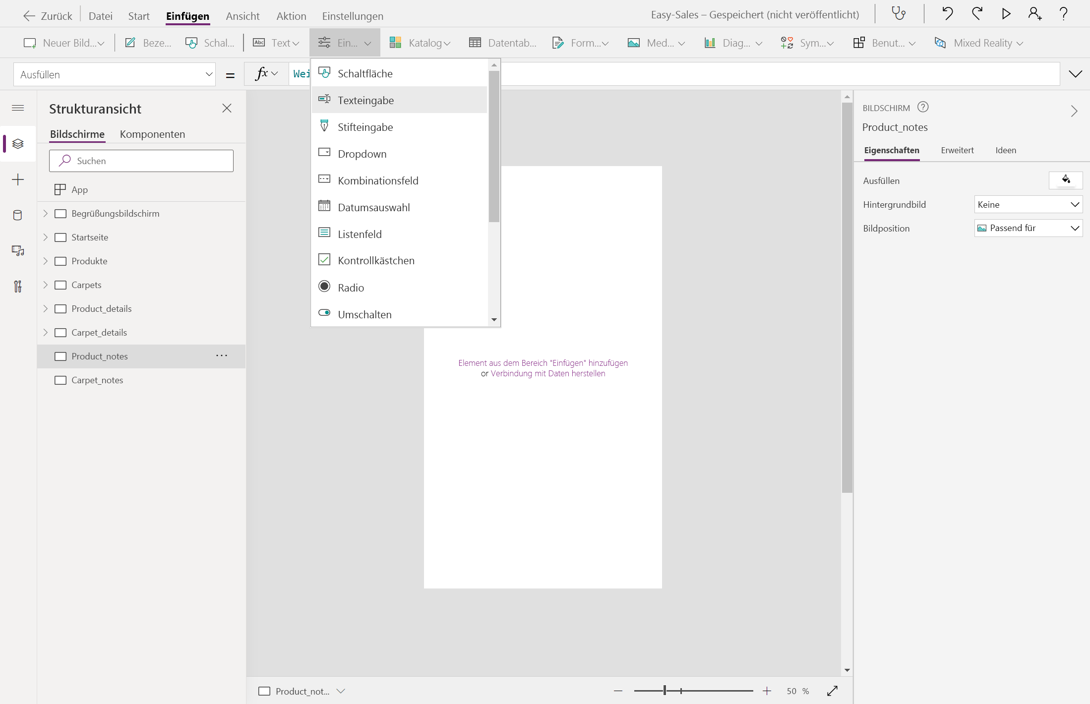 Entwerfen Sie die seite Product_notes : Wählen Sie das Dropdownmenü " Eingabe " aus, und wählen Sie dann "Texteingabe" aus. Benennen Sie sie TextInput_products um.