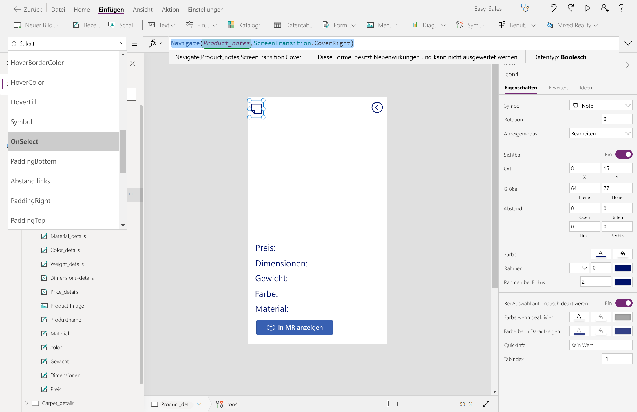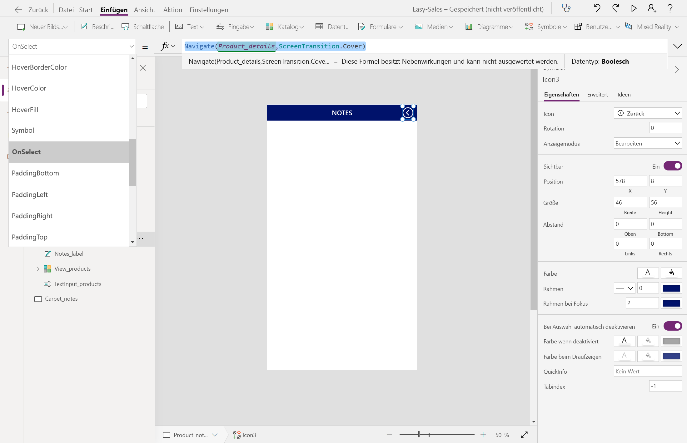 Navigate(Product_details,ScreenTransition.Cover)Wechseln Sie zum Product_details-Bildschirm und fügen Sie auf der Registerkarte Einfügen ein Notizsymbol aus der Dropdown-Liste Symbole hinzu.