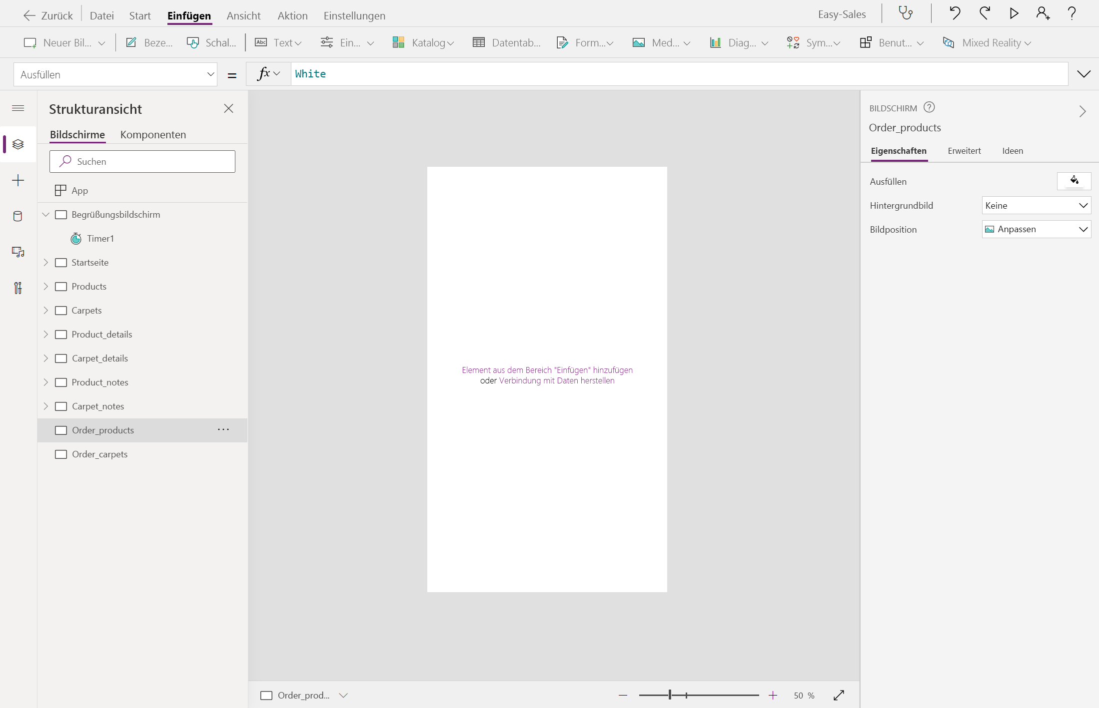 Erstellen Sie zwei neue leere Bildschirme, und benennen Sie sie Order_products und Order_carpets um.