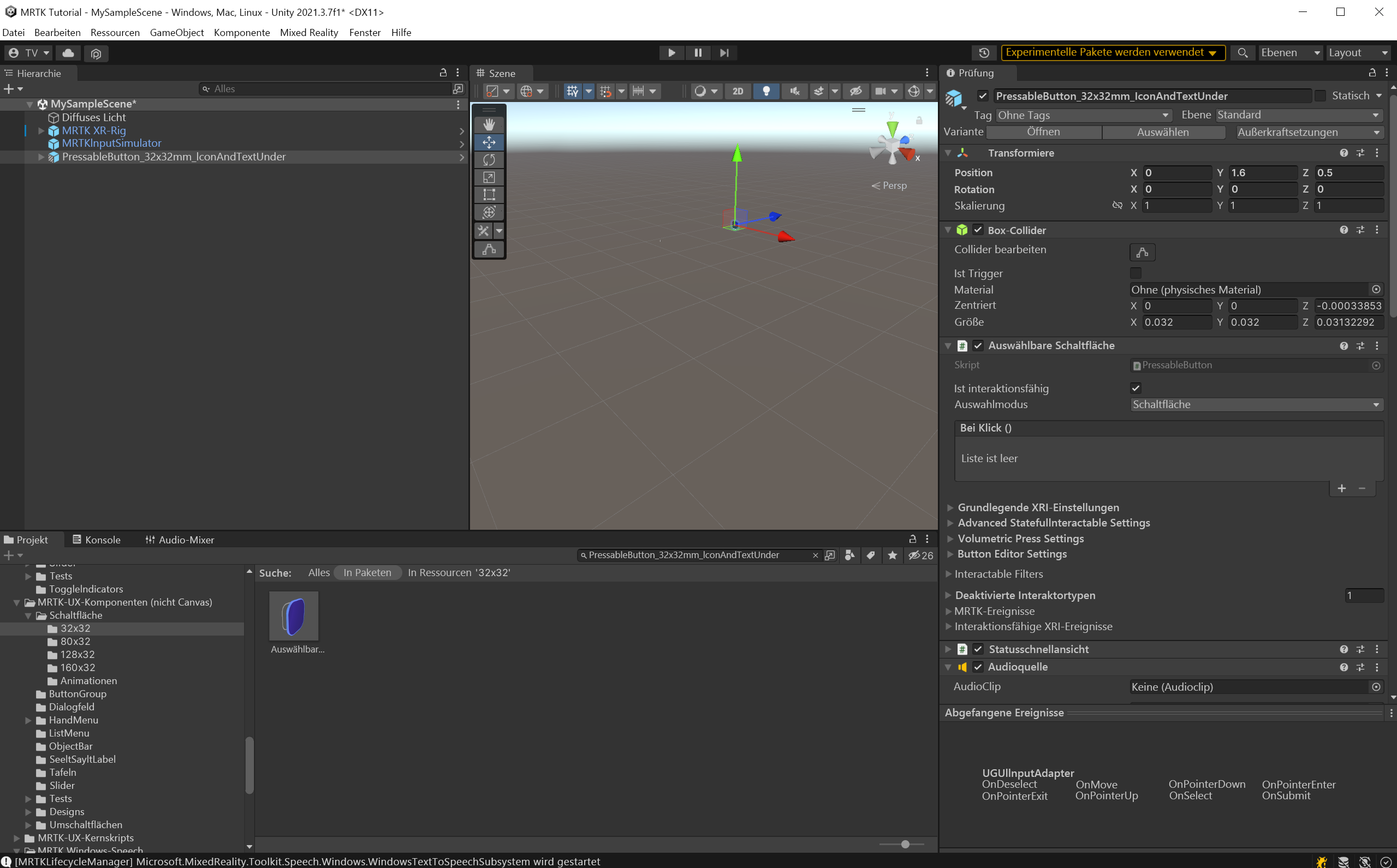 Um das Schaltflächen-Prefab hinzuzufügen, wählen Sie im Projektfenster"Pakete " aus, und geben Sie in der Suchleiste "PressableButton_32x32mm_IconAndTextUnder" ein.