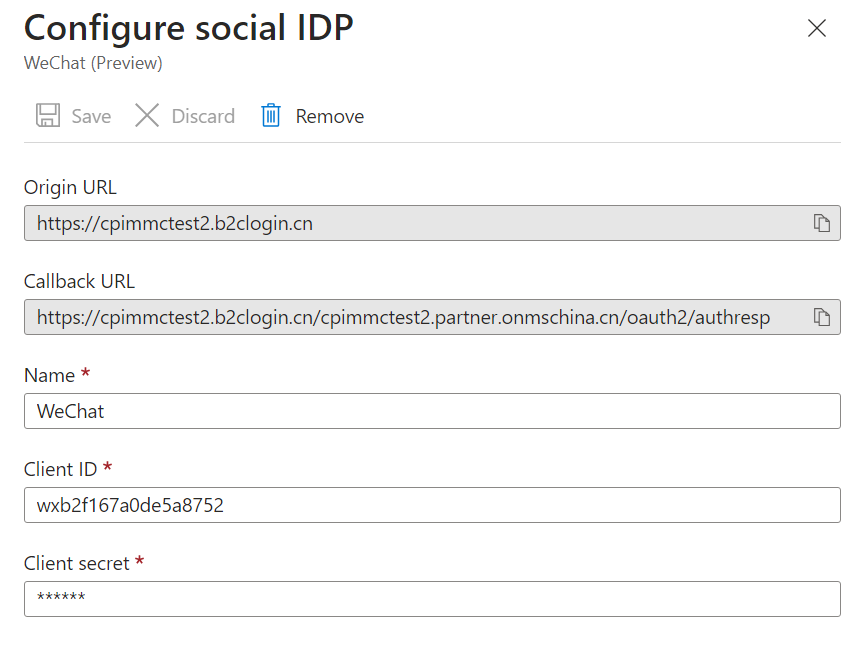 WeChatSecret. The prefixB2C_1A_is added automatically to the name of your key. - In Secret, enter your client secret that you previously recorded.