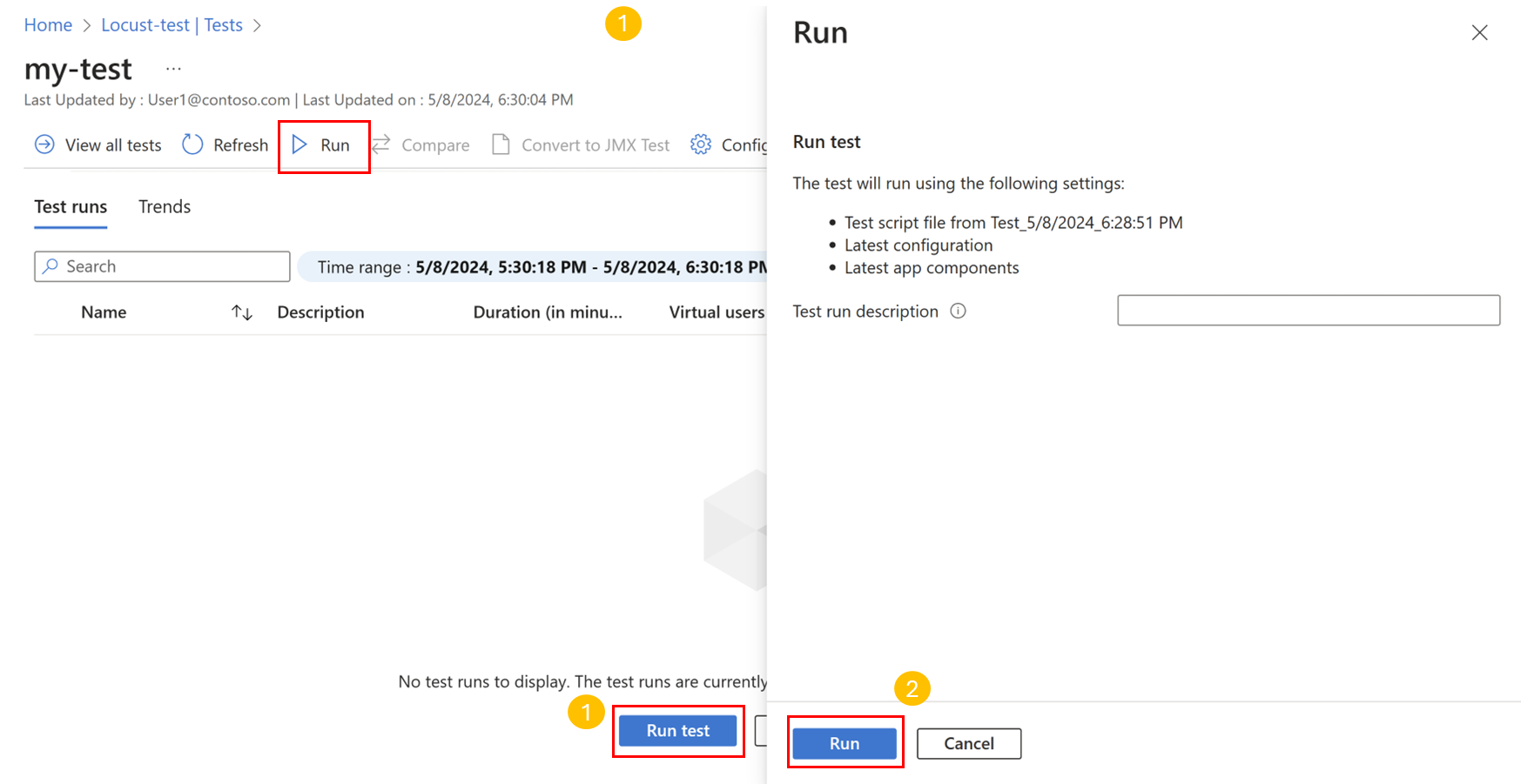 2. On the test details page, select Run or Run test. Then, select Run on the confirmation pane to start the load test. Optionally, provide a test run description.