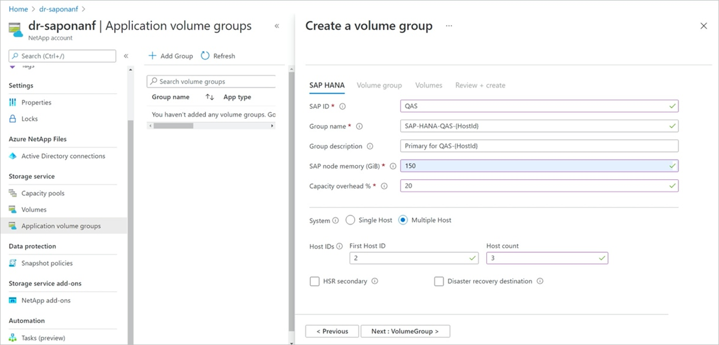 In the example screenshot below, the group name SAP-HANA-SH9-{HostId} is a generic name. The corresponding numeric host ID for each host you add replaces {HostId}. Also, the numeric host ID for the volume group description replaces {HostId}. If {HostId} isn't specified, it's appended to the end for both the group name and description.