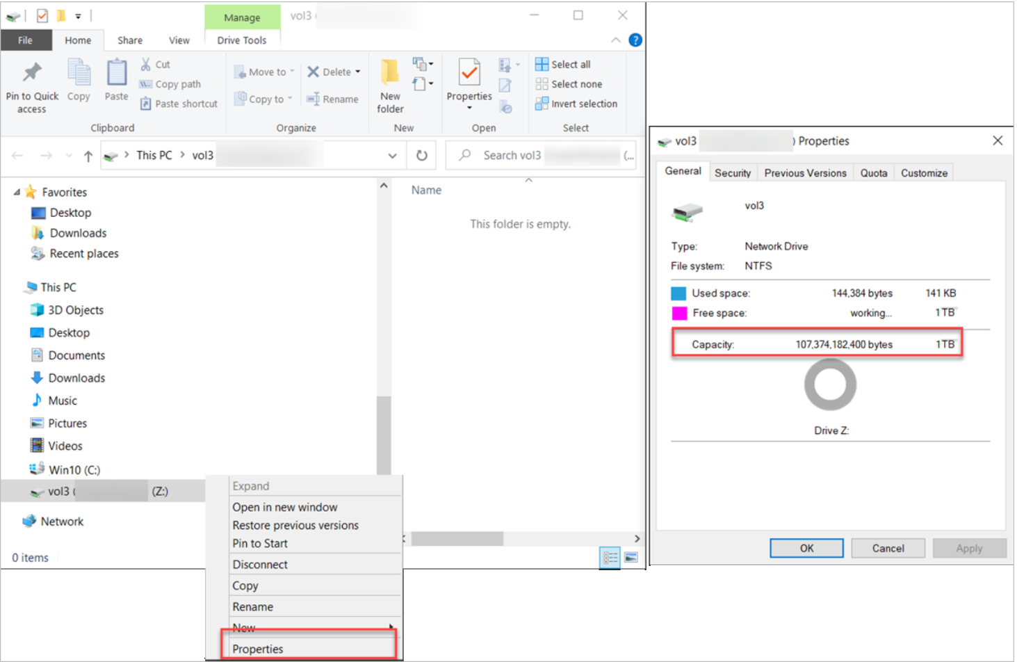 • Navigate to File Explorer, right-click the mapped drive, then select Properties to display capacity.