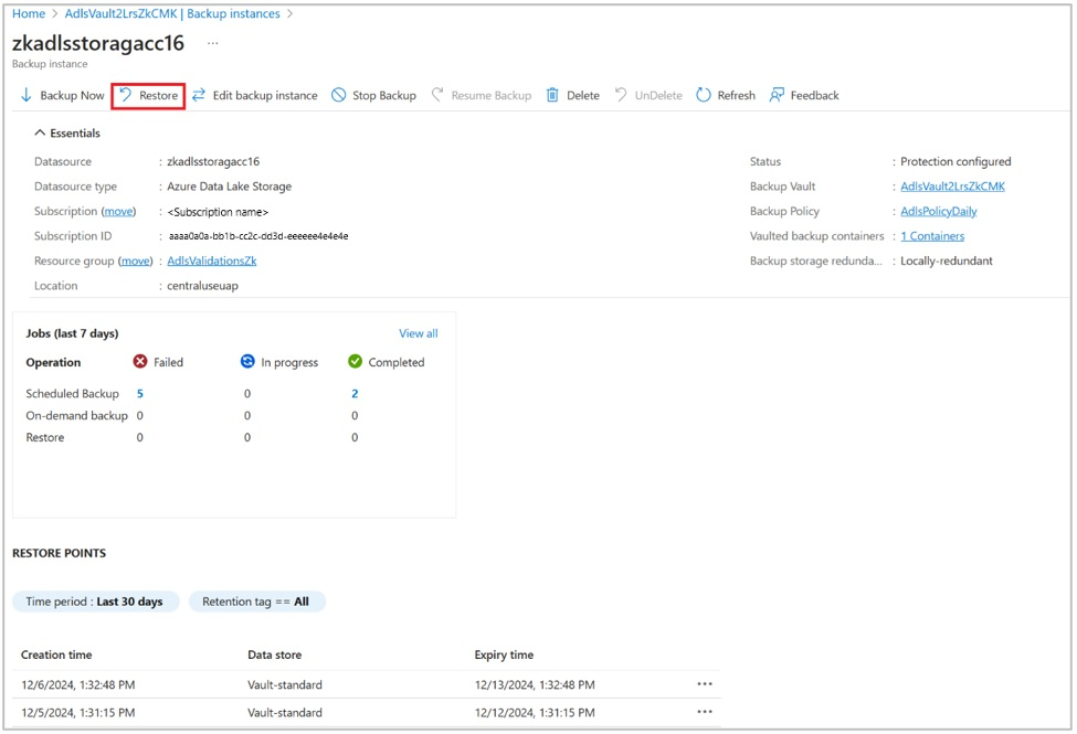 On the Backup Instances pane, select the storage account with Data Lake Storage, and then select Restore.