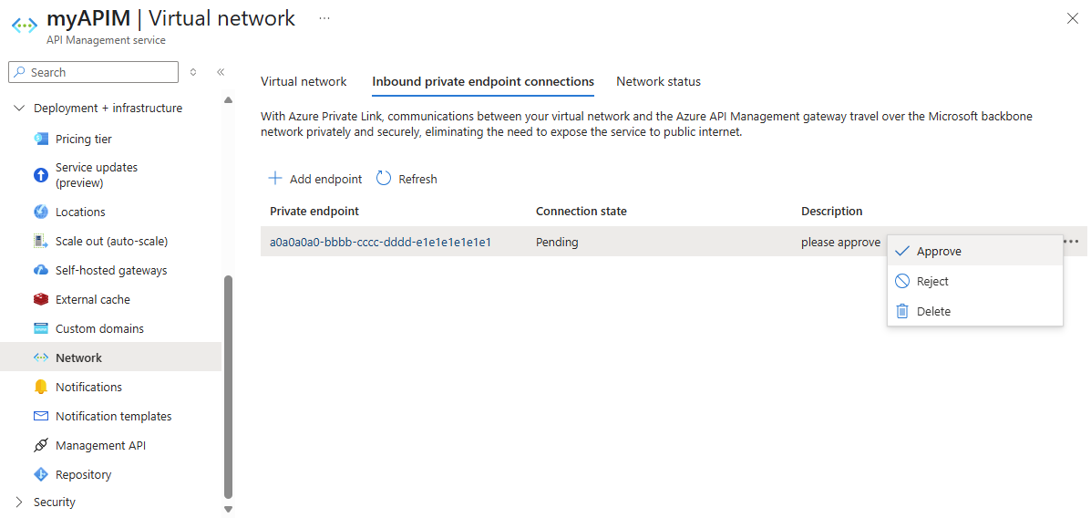 az network private-endpoint-connection list --name myAPIM --resource-group myResourceGroup --type Microsoft.ApiManagement/serviceRun az network private-endpoint-connection approve to approve the private endpoint connection using the name from the previous step.