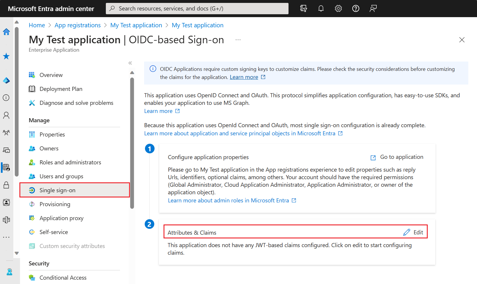 From the Overview page of My Test application, navigate to Manage, and select Single sign-on.