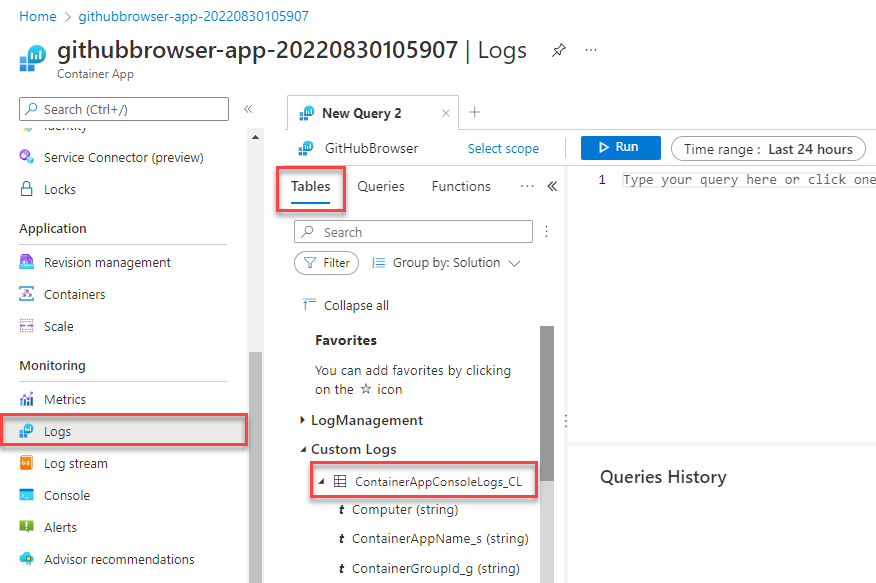 3. Expand the Custom Logs item to reveal the ContainerAppConsoleLogs_CL node. This table holds various logs for the container app that can be queried to troubleshoot problems.