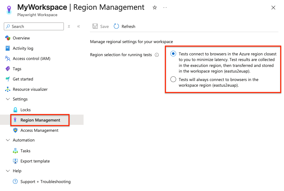 By default, when you create a new workspace, the service runs tests in an Azure region closest to the client machine. When you disable this setting on the workspace, the service uses remote browsers in the Azure region of the workspace.