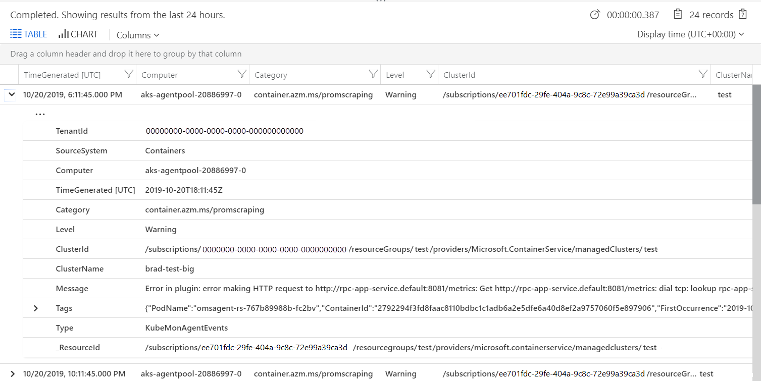 To investigate any configuration or scraping errors, the following example query returns informational events from the KubeMonAgentEvents table.