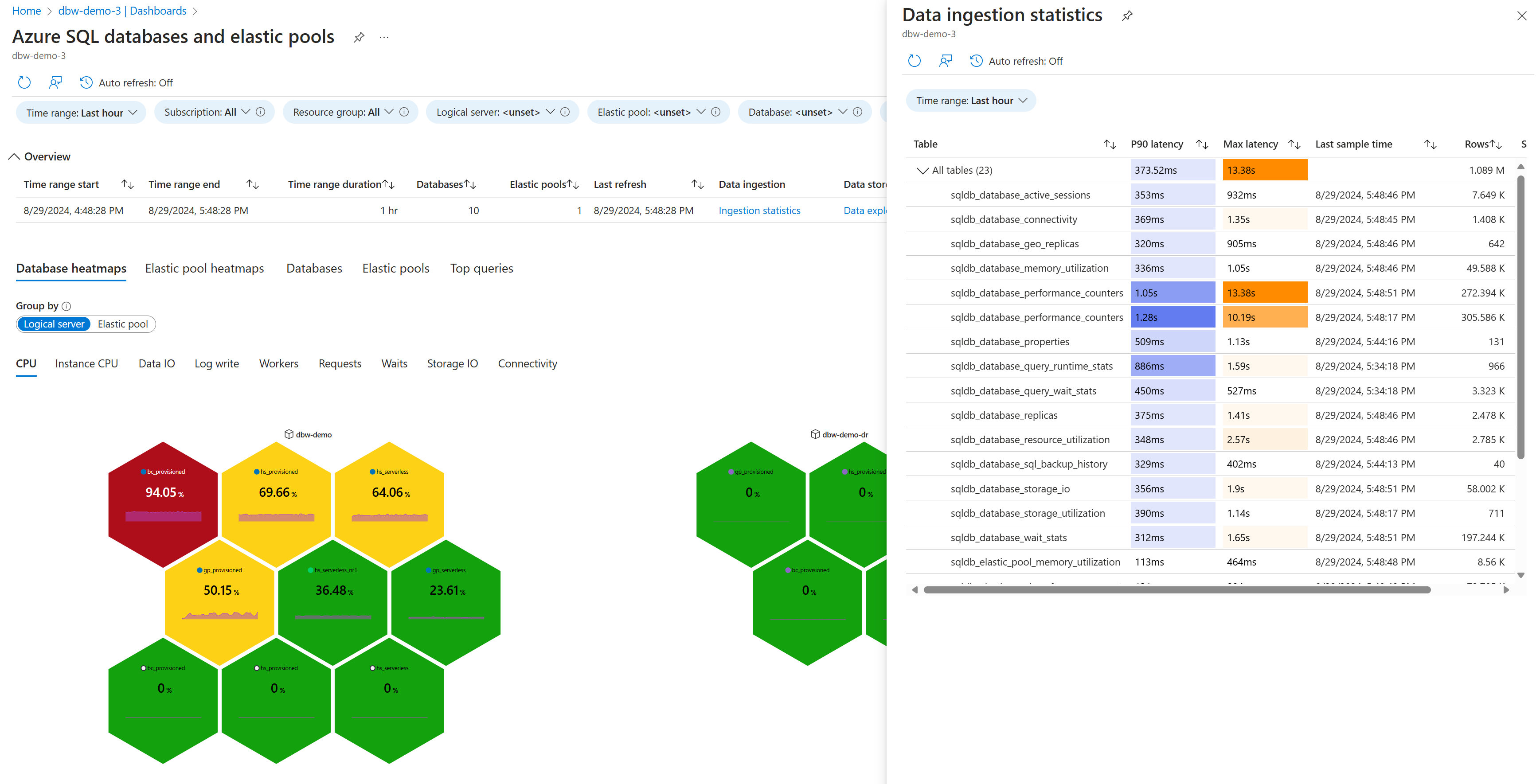 Here is an example of a database CPU utilization heatmap on the estate dashboard. Each hexagon represents a SQL target. There are two logical servers, one with six databases and one with three databases. The high availability secondary replicas are shown on the heatmap as separate targets. Select the image to see additional details, including data ingestion statistics.