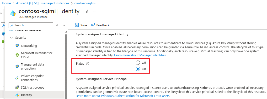 You must enable the instance identity (SMI or UMI) to allow support for Microsoft Entra authentication in SQL Managed Instance. For SQL Database, enabling the server identity is optional and required only if a Microsoft Entra service principal (Microsoft Entra application) oversees creating and managing Microsoft Entra users, groups, or applications in the server. For more information, see Microsoft Entra service principals with Azure SQL.