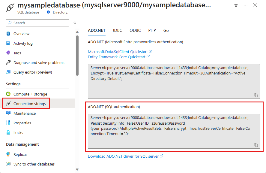1. Navigate to the database pane in the Azure portal and, under Settings, select Connection strings.