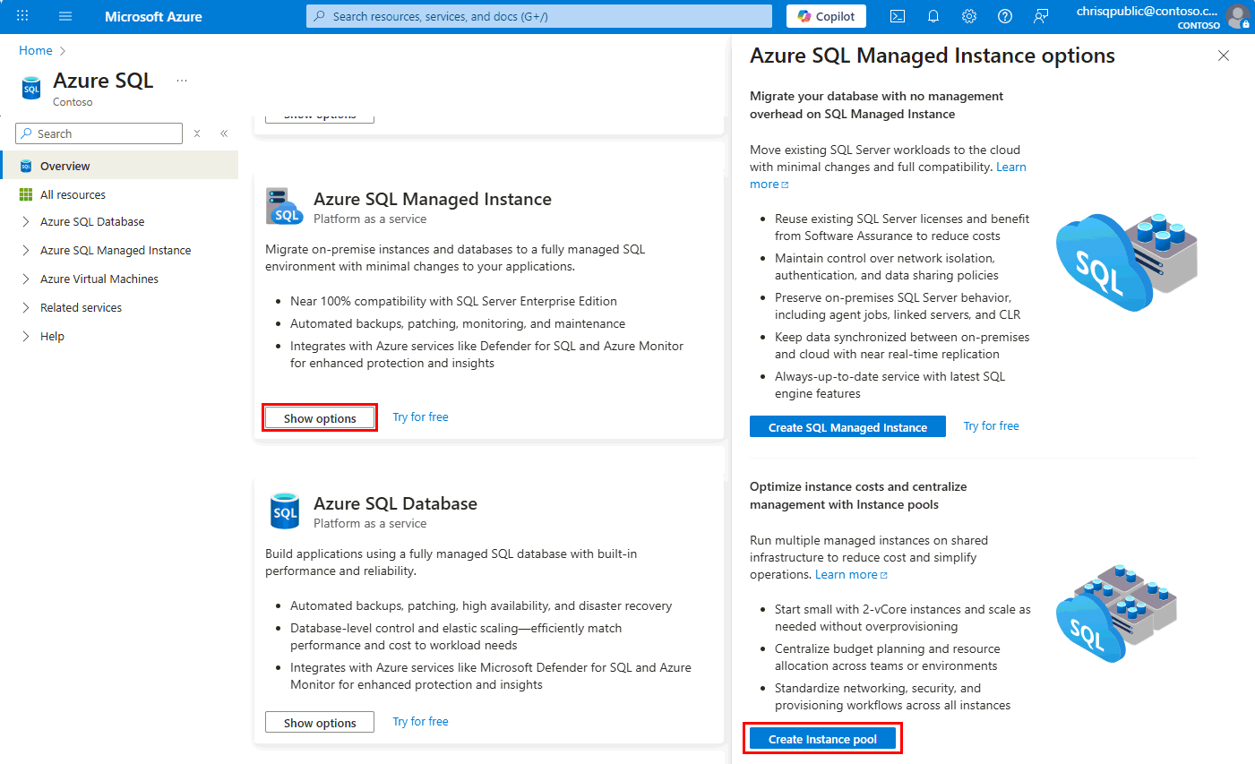 1. Go to Azure SQL hub at aka.ms/azuresqlhub. In the pane for Azure SQL Managed Instance, select Show options.