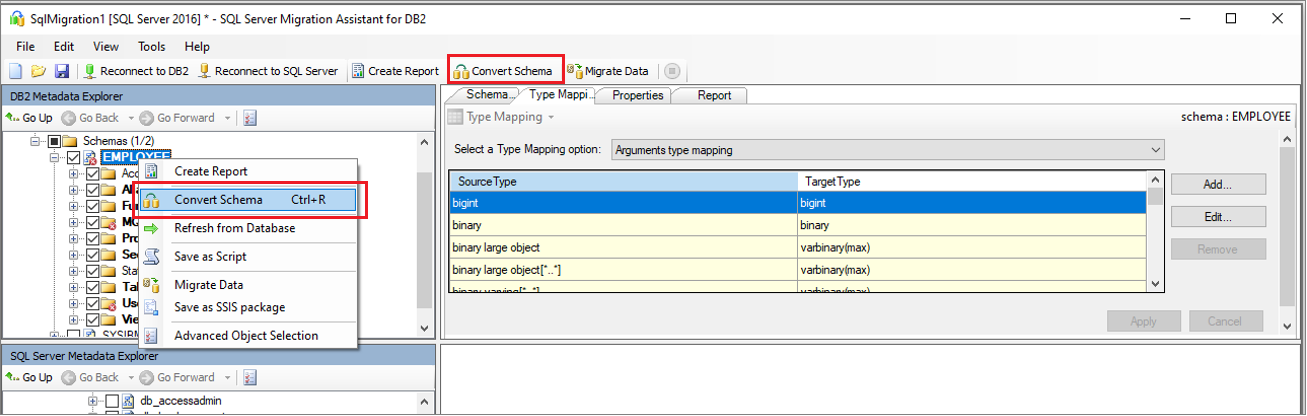 Right-click the schema and then choose Convert Schema. Alternatively, you can choose Convert Schema from the top navigation bar after selecting your schema.