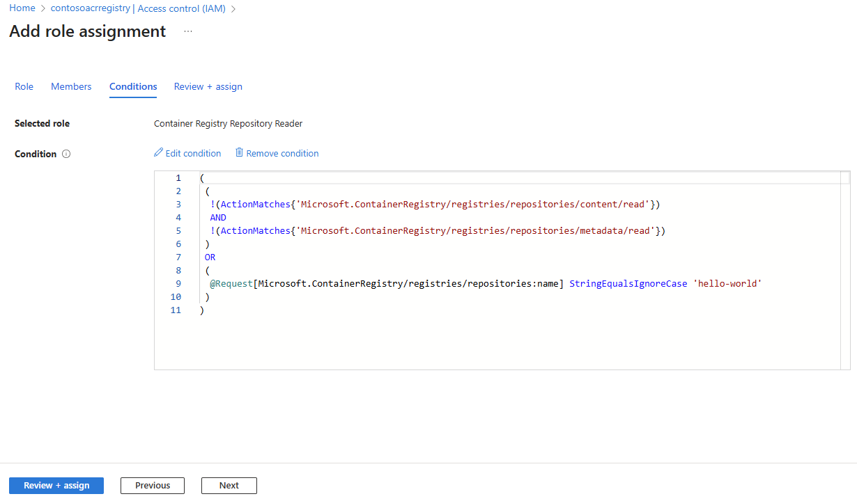 By adding ABAC conditions, this role assignment lets the identity pull images, view tags, and read metadata only from the specified repositories, preventing access to other repositories in the registry.