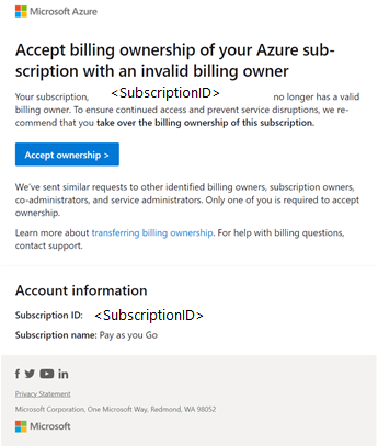 When a subscription no longer has a valid billing account owner, Azure sends an email to other Billing account owner and Subscription Owners informing them of the situation and provides them with a link to accept billing ownership of the subscription. Any one of the users can select the link to accept billing ownership. For more information about billing roles, see Billing Roles and Azure roles, Microsoft Entra roles, and classic subscription administrator roles.