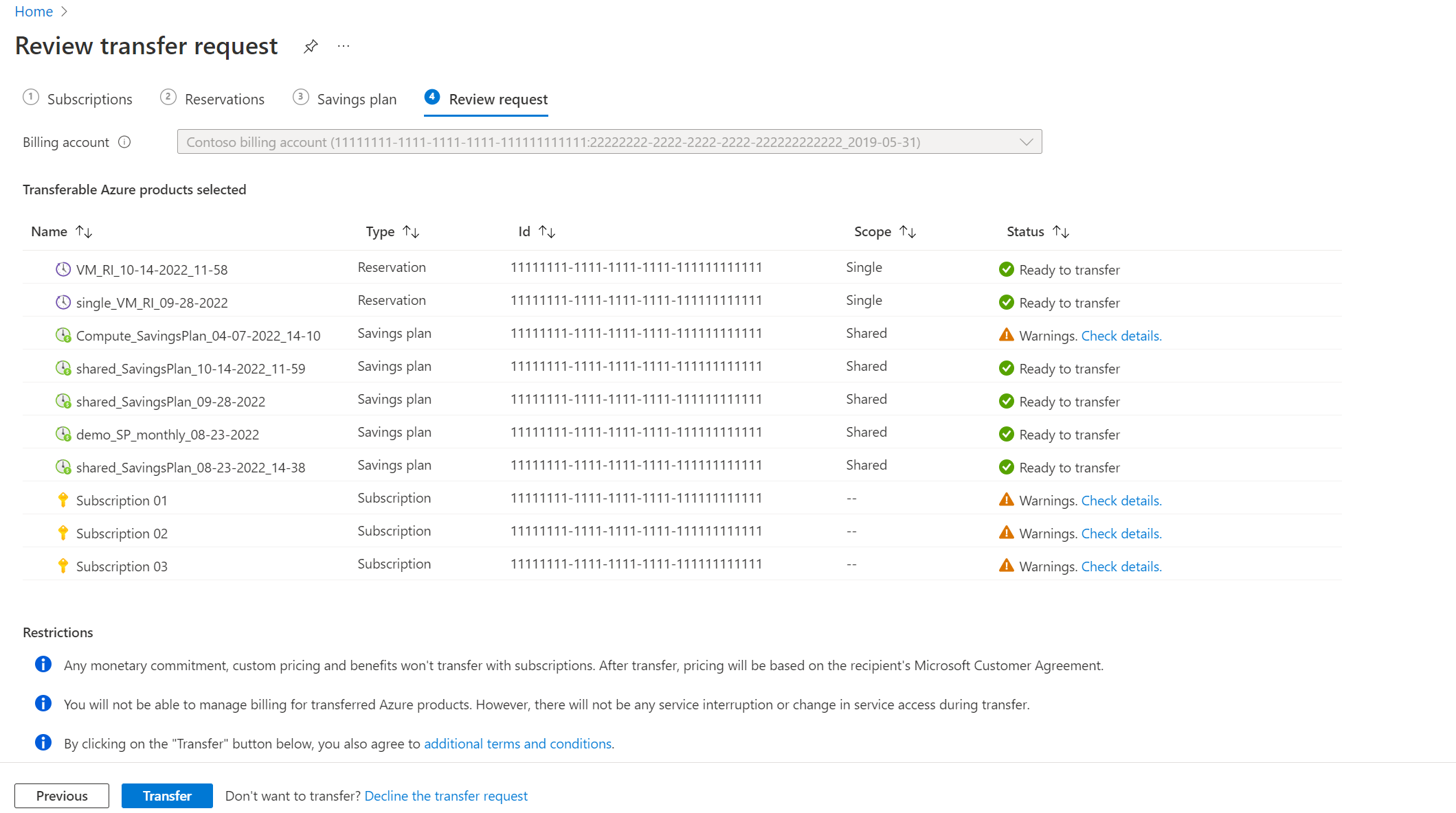 5. Select the Review request tab and verify the information about the products to transfer. If there are Warnings or Failed status messages, see the following information. When you're ready to continue, select Transfer.