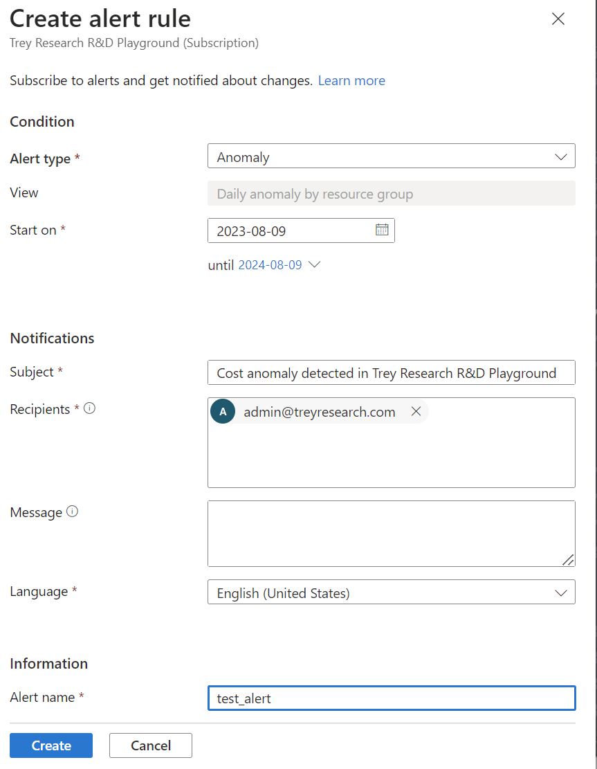 If you get an error message indicating that you reached the limit of five alerts per subscription, consider editing an existing anomaly alert rule. Add yourself as a recipient instead of creating a new rule in case you exhausted the limit.
