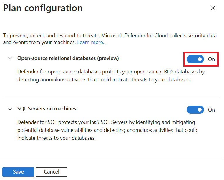 Learn more about this Microsoft Defender plan in Overview of Microsoft Defender for open-source relational databases.