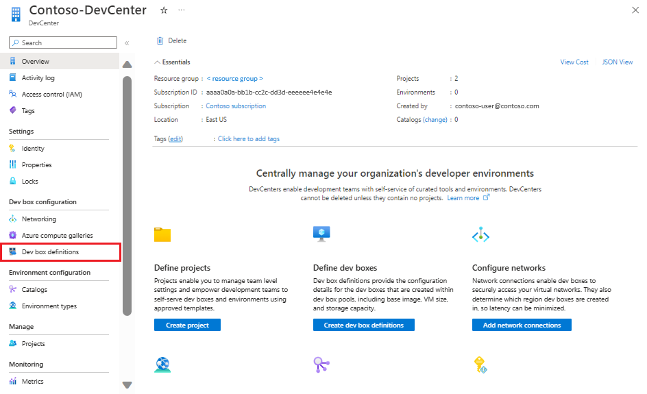 | Create, delete, or update a dev box definition | Owner, Contributor, or Write permissions on the dev center in which you want to create the dev box definition. |