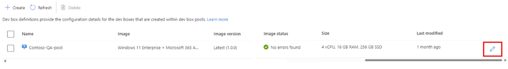 Select the dev box definitions that you want to update, and then select the edit (pencil) button.