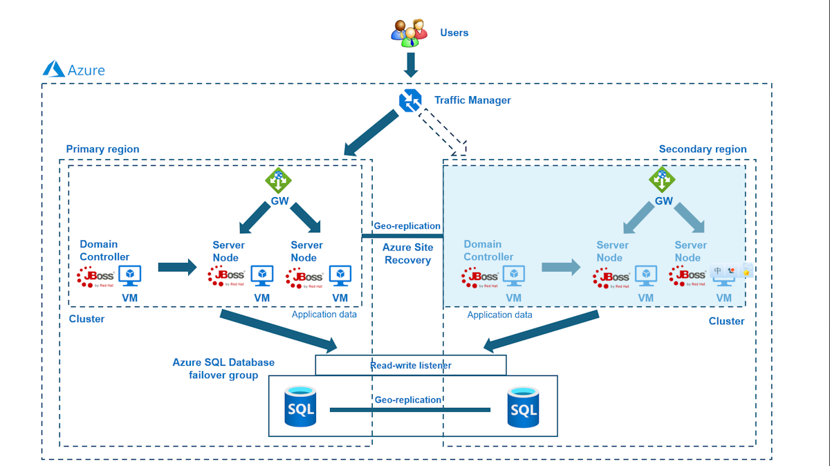 Azure Traffic Manager checks the health of your regions and routes the traffic accordingly to the application tier. The primary region has a full deployment of the JBoss EAP cluster. After the primary region is protected by Azure Site Recovery, you can restore the secondary region during the failover. As a result, the primary region is actively servicing network requests from the users, while the secondary region is passive and activated to receive traffic only when the primary region experiences a service disruption.
