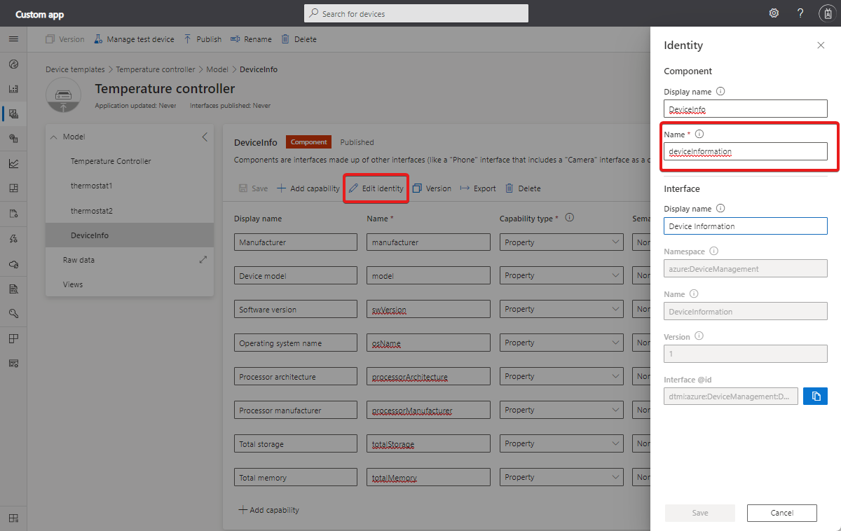 To find a device template ID, navigate to the Devices page in your IoT Central application and hover over a device that uses the template. The card includes the device template ID: