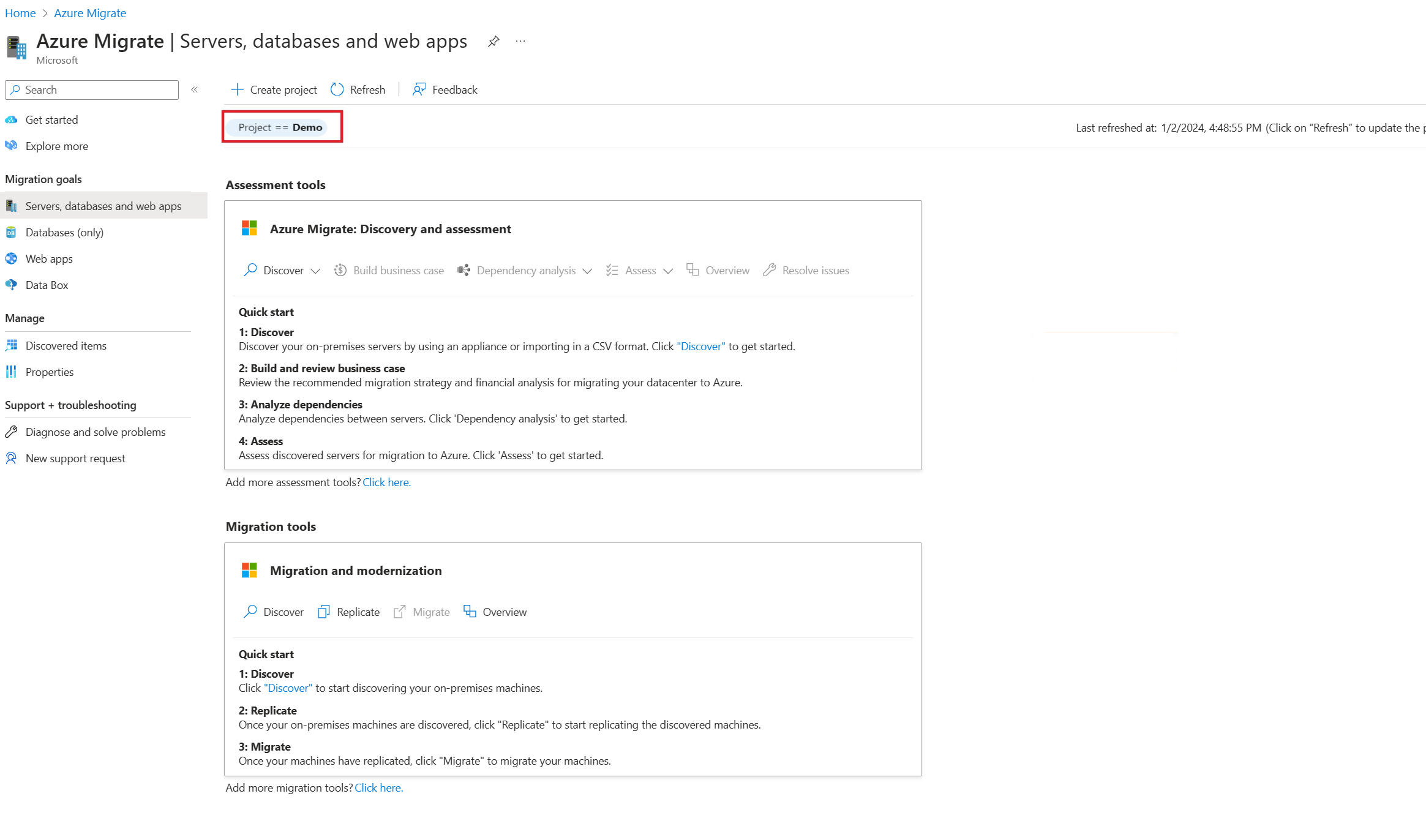 Classic Azure Migrate is retiring in Feb 2024. After Feb 2024, the classic version of Azure Migrate will no longer be supported and the inventory metadata in the classic project will be deleted. If you're using classic projects, delete those projects and follow the steps to create a new project. You can't upgrade classic projects or components to Azure Migrate. View FAQ before you start the creation process.