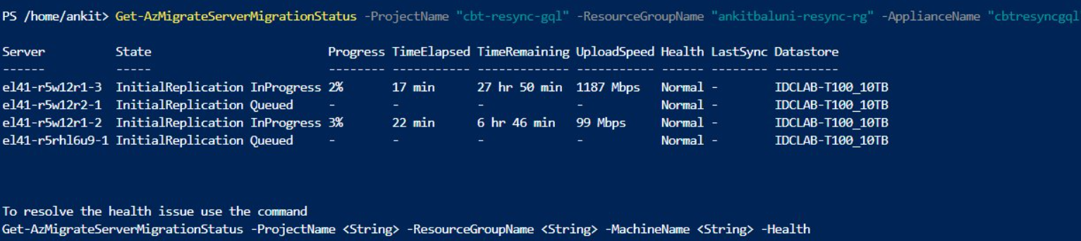 Get-AzMigrateServerMigrationStatus -ProjectName "<your-project-name>" -ResourceGroupName "<your-resource-group>" -MachineName "<your-server-name>" -Health