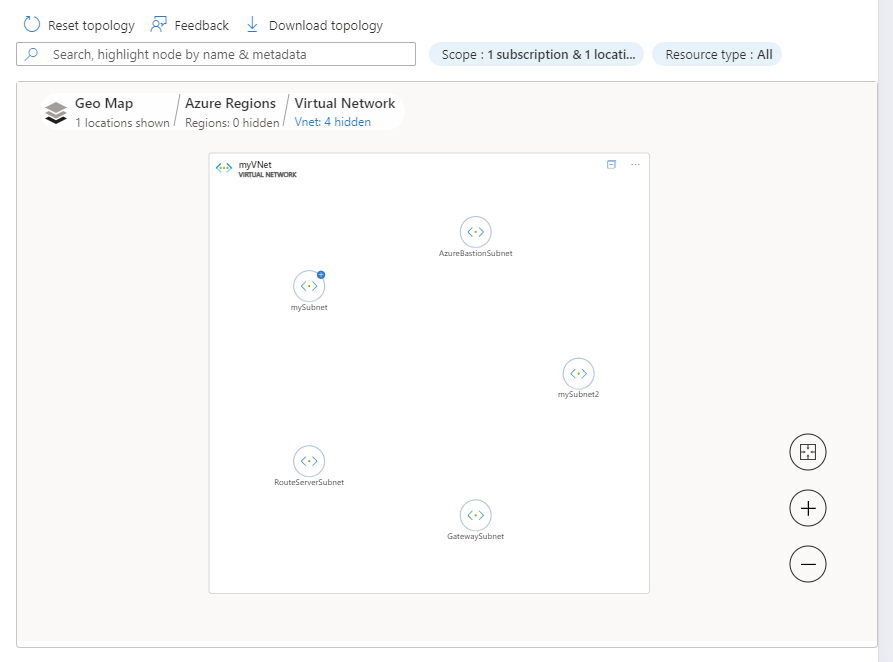 Topology provides an interactive interface to view resources and their relationships in Azure across multiple subscriptions, regions, and resource groups. It helps you manage and monitor your cloud network infrastructure with interactive graphical interface that provides you with insights from Azure Network Watcher connection monitor and traffic analytics. Topology helps you diagnose and troubleshoot network issues by providing contextual access to Network Watcher diagnostic tools such as connection troubleshoot, packet capture, and next hop.