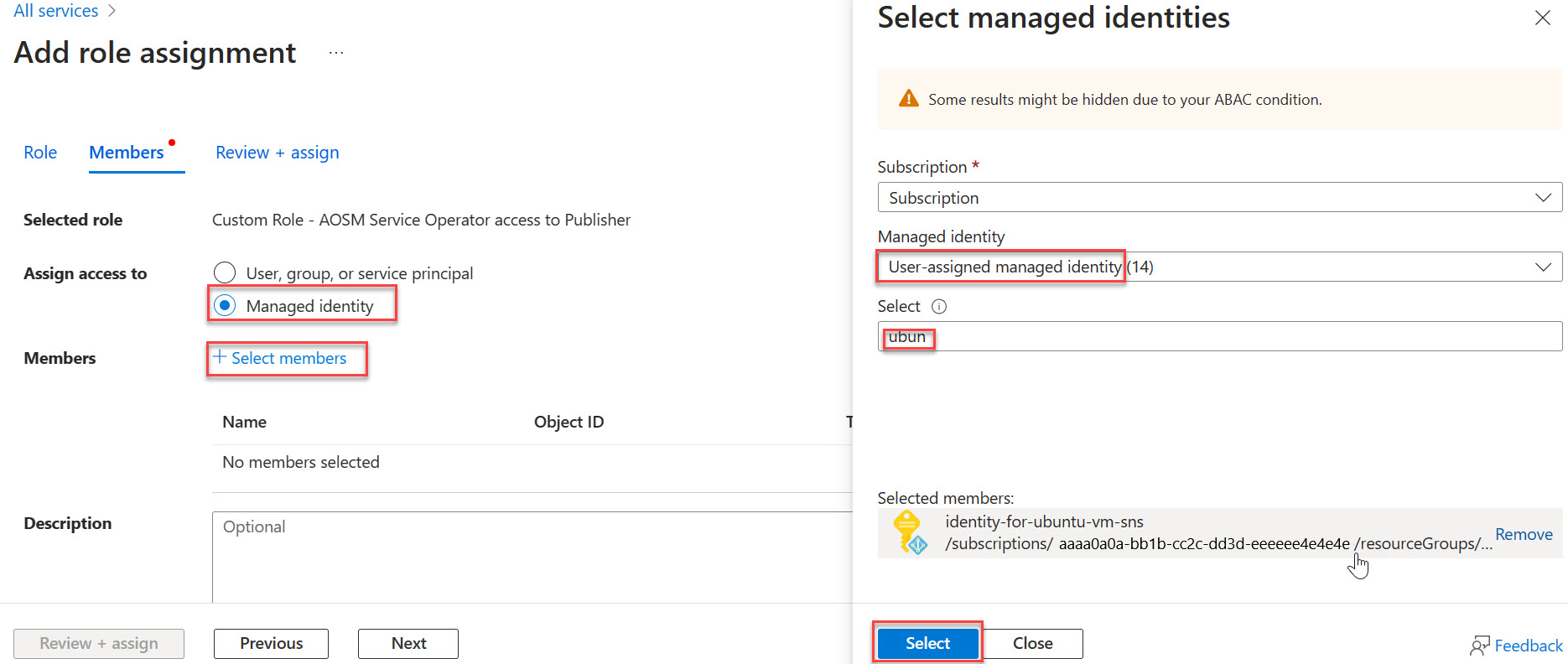 Select + Select members and navigate to the user-assigned managed identity and proceed with the assignment.