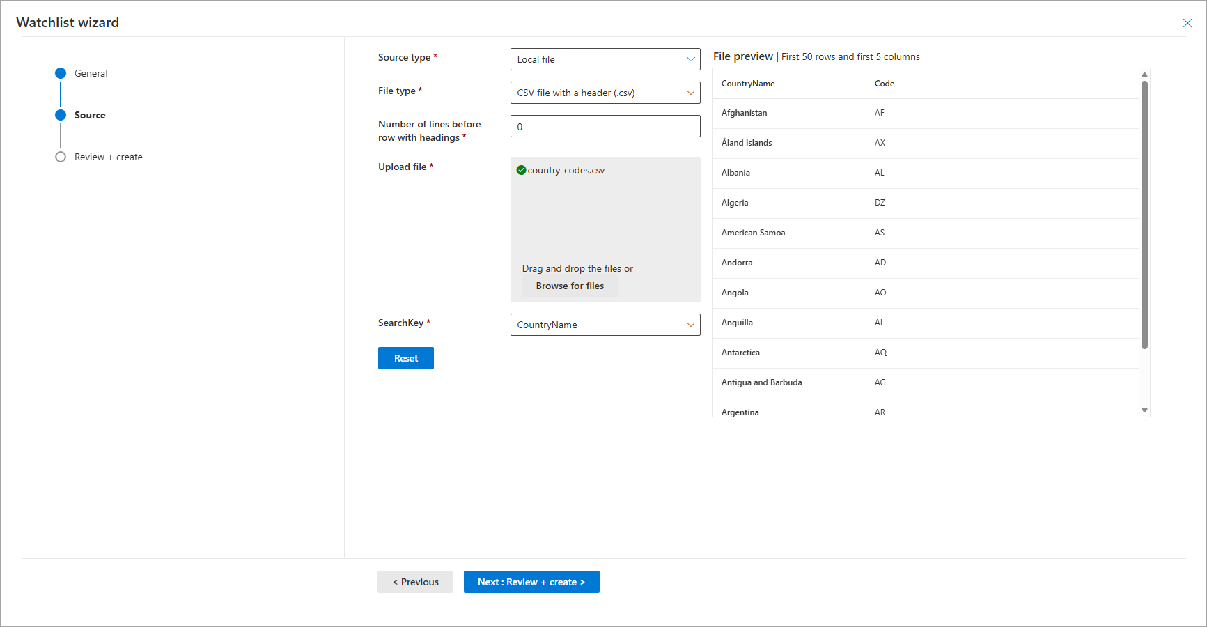 On the Source page, use the information in the following table to upload your watchlist data, and then select Next: Review + create.