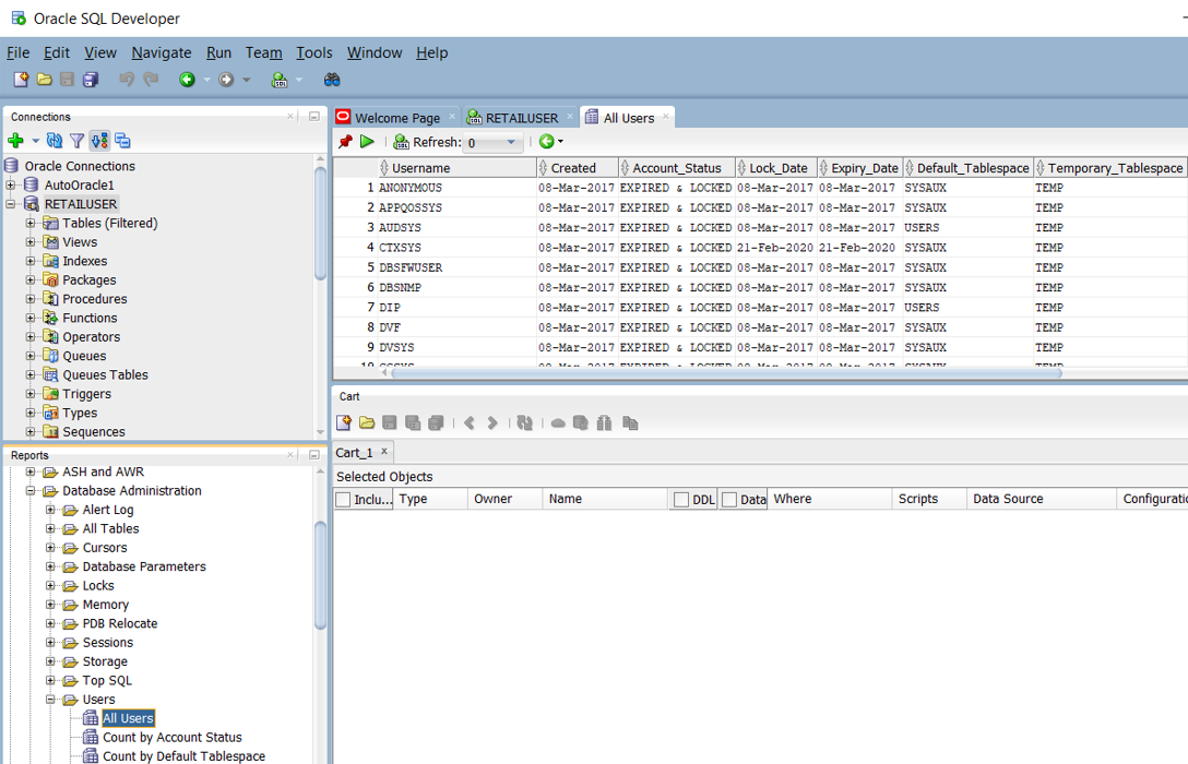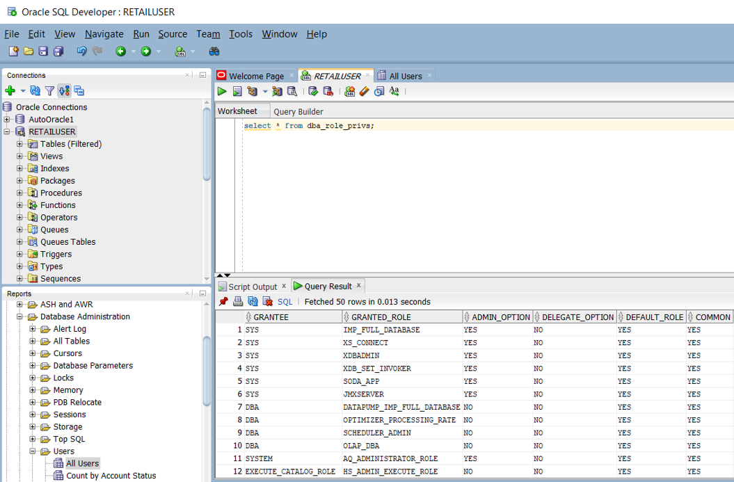 Oracle SQL Developer has built-in options to display user and role information in the Reports pane, as shown in the following screenshot.