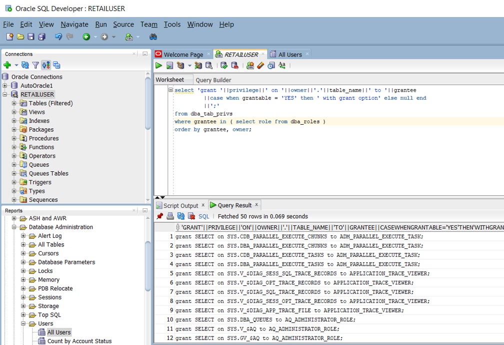 You can also create queries to produce a script that's a series of CREATE and GRANT statements for Azure Synapse, based on the existing Oracle privileges. The following Oracle SQL Developer screenshot shows an example of that script.