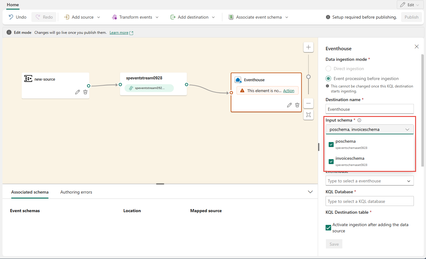 4. If you are using schemas at the source, see Configure Eventhouse destination to use schemas.