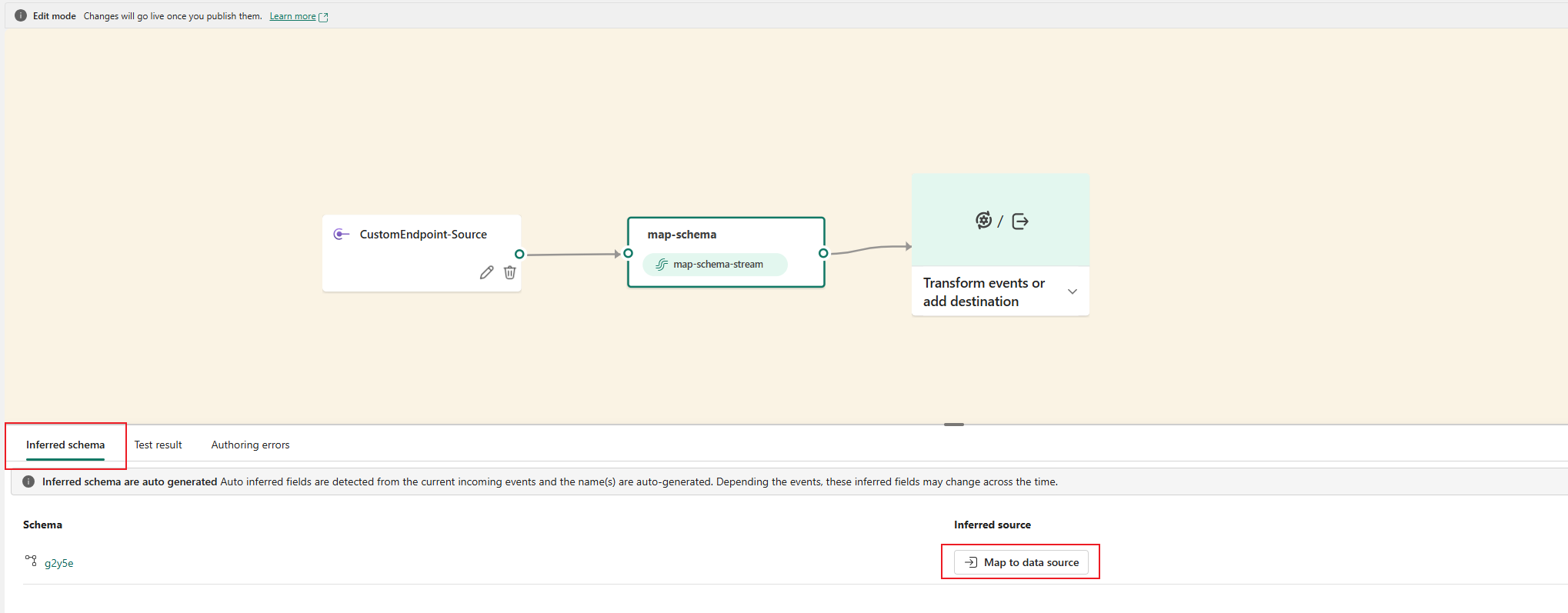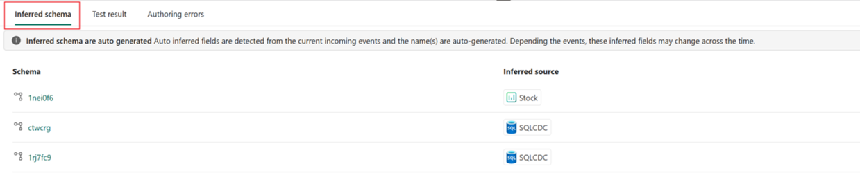 You can select an inferred schema in Edit mode to view the test result if the source supports data preview, or if it doesn't but the eventstream is published and data flows into the default stream.