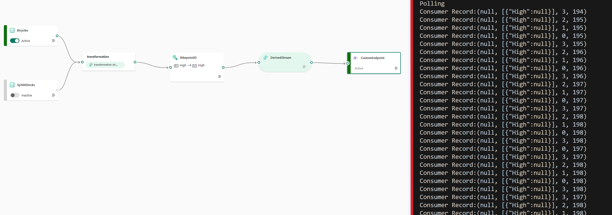 For example, if you select a schema from Sp500stocks but you receive data from Bicycles, the event still reaches the custom endpoint. The selected fields show null values.