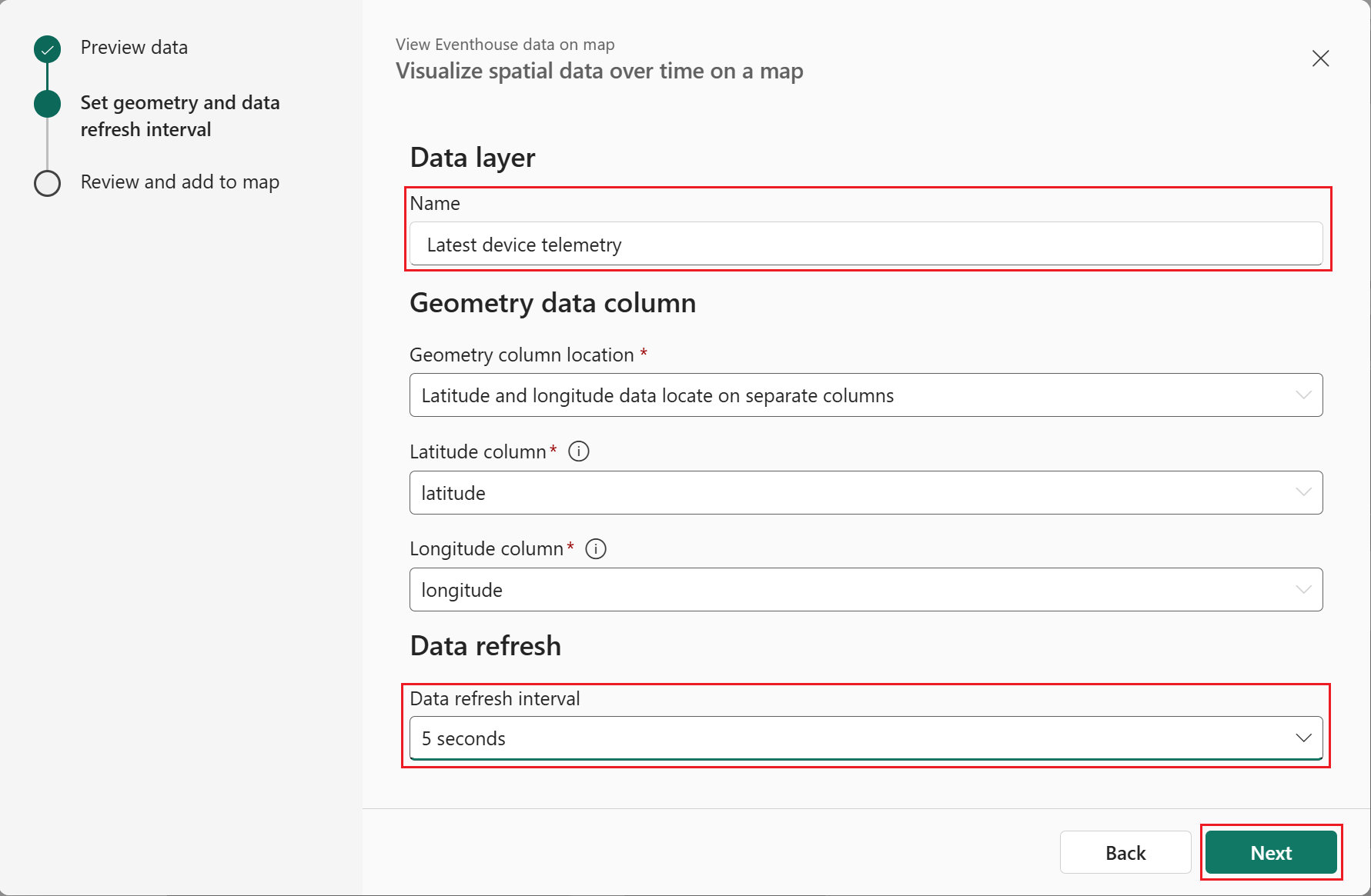 - Enter the desired name and query refresh interval, then select Next to proceed to Review and add to map.