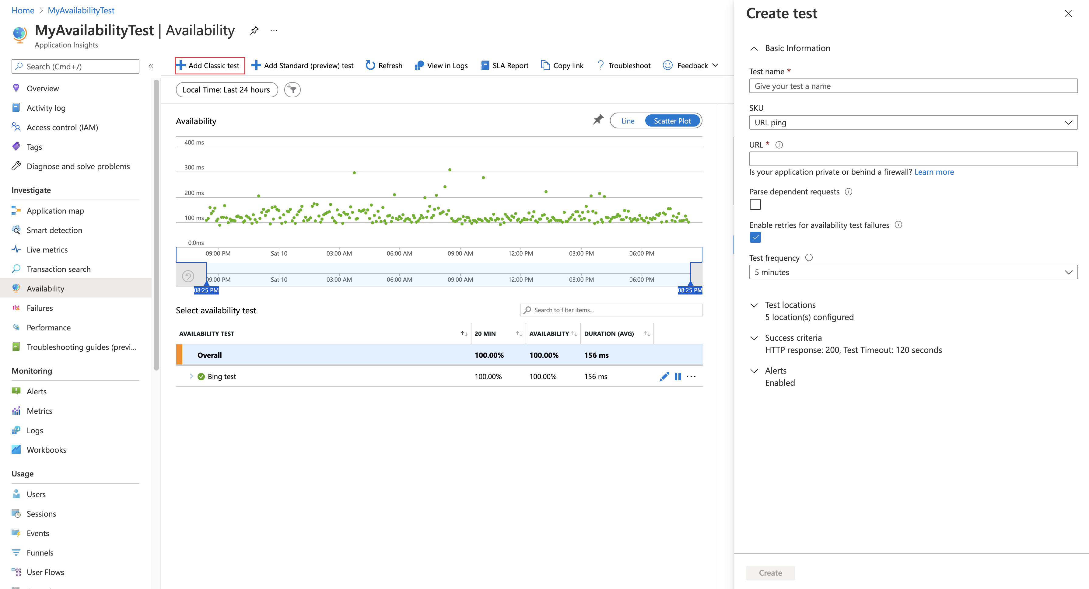 In your Application Insights resource, open the Availability pane and select Add Classic Test.