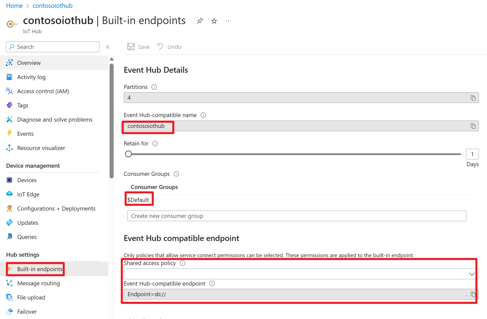 Within the connection string, you can find a service bus URL (URL of the underlying event hub namespace), which you need to add as a bootstrap server in your Kafka source. In this example, it's iothub-ns-contosoiot-55642726-4642a54853.servicebus.windows.net:9093.
