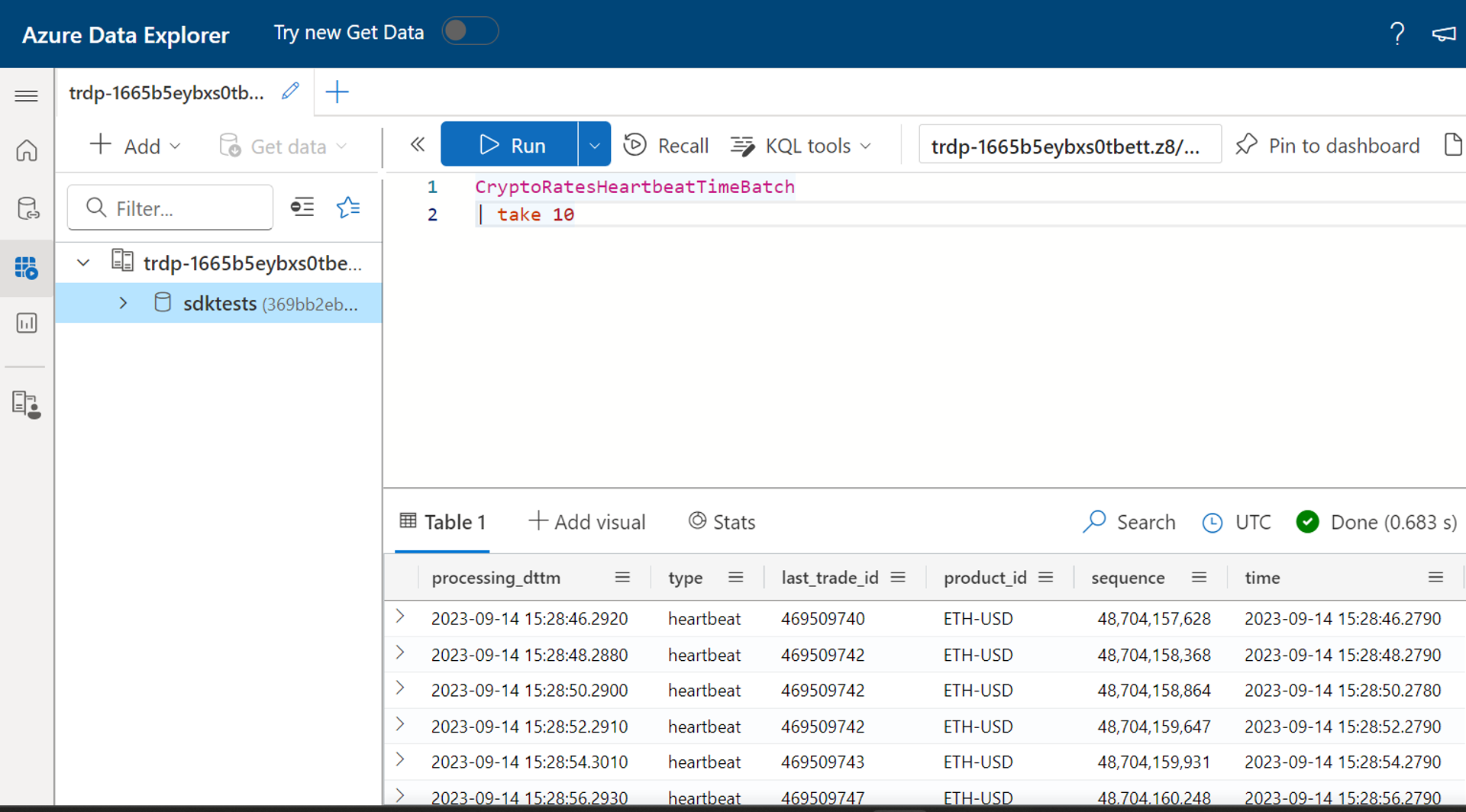 .create table CryptoRatesHeartbeatTimeBatch (processing_dttm: datetime, ['type']: string, last_trade_id: string, product_id: string, sequence: long, ['time']: datetime)