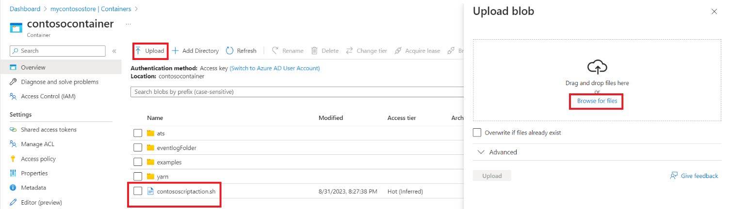 ADLS/WASBstorage(doesn't have to be the primary cluster storage). In this example we consider anADLSstorage. To upload a script into your storage, navigate into the target storage and the container where you want to upload it.To upload a script into your storage, navigate into the target storage and the container. Click on the upload button and select the script from your local drive. After the script gets uploaded you should be able to see it in the container(see following image).