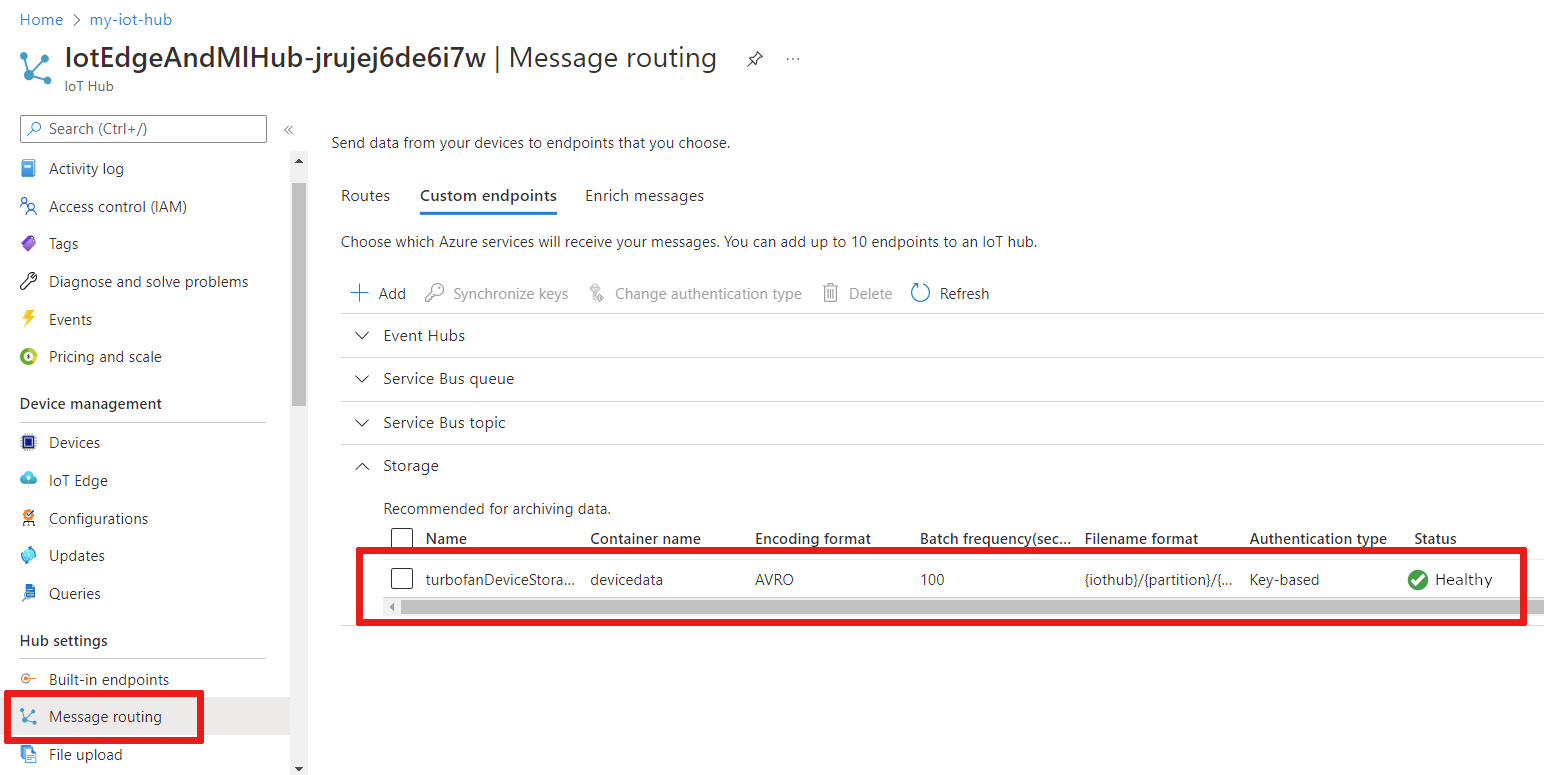 IoT Hub uses routes to direct incoming data from IoT devices to other downstream services. We will take advantage of IoT Hub routes to send device data to Azure Storage. In Azure Storage, the device data is consumed by Azure Machine Learning to train our remaining useful life (RUL) classifier.